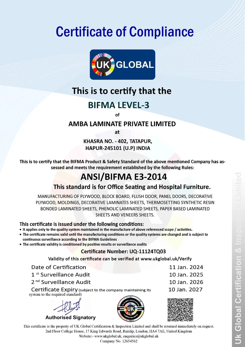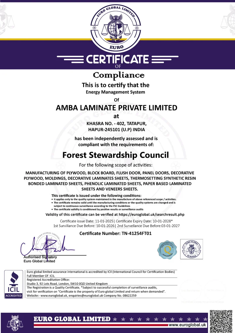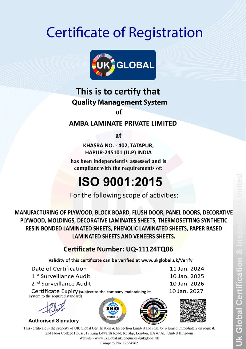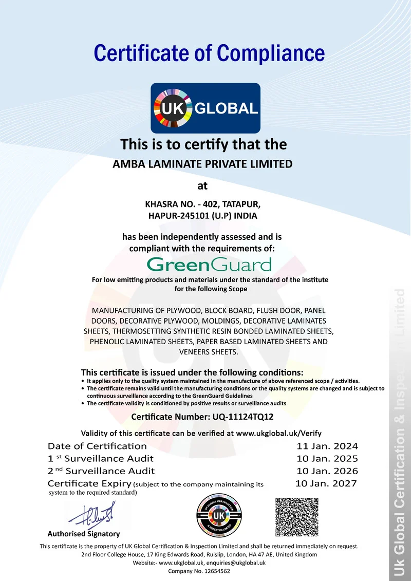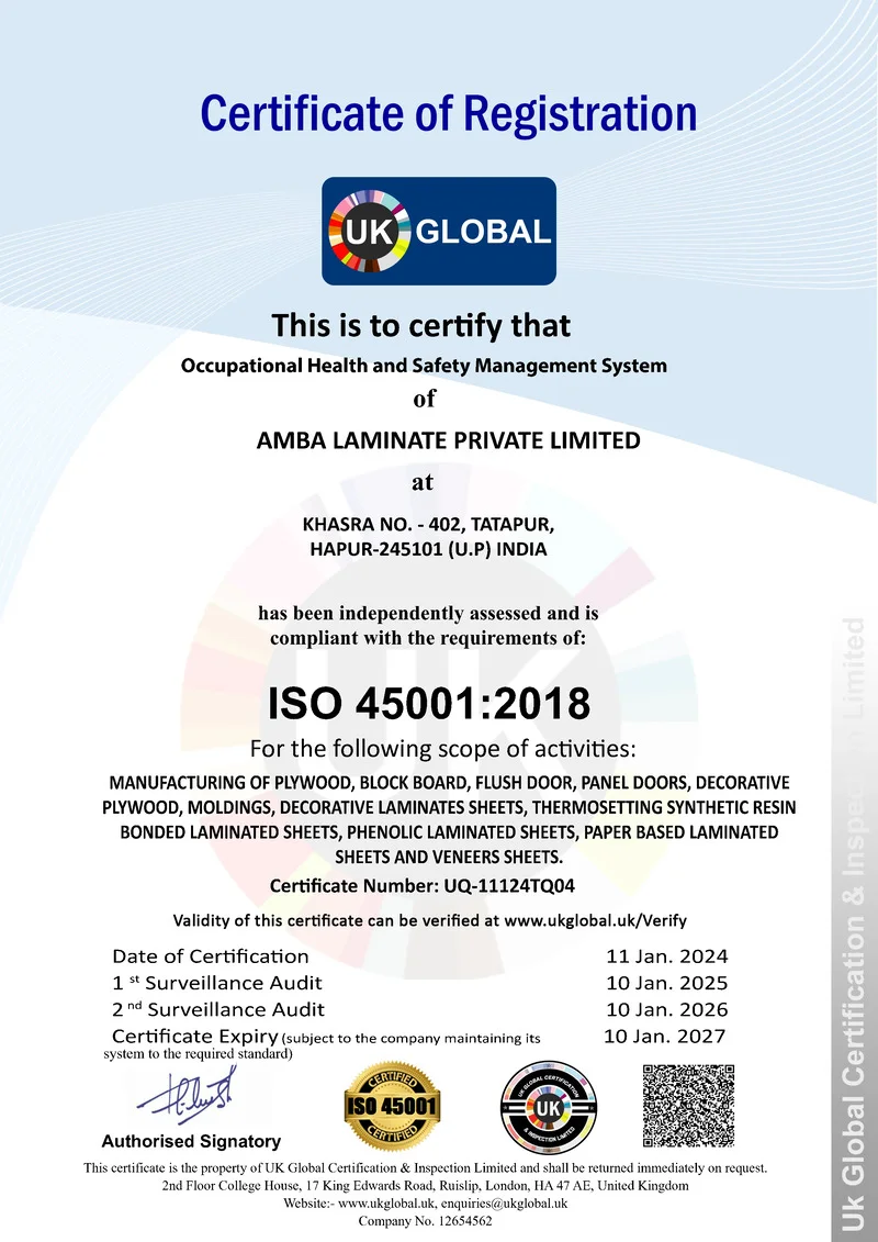 Yes, Ogaan Laminates is a certified laminate manufacturer. Our facility is ISO 9001:2000 certified, ensuring the highest standards of quality management and customer satisfaction. In addition, we follow ISO 14001 (environmental management) and ISO 18001 (occupational health & safety) standards, making our laminates not only premium in design but also reliable, sustainable, and safe. With these global certifications, Ogaan Laminates guarantees quality, durability, and eco-friendly practices, making us a trusted choice for architects, interior designers, and homeowners.