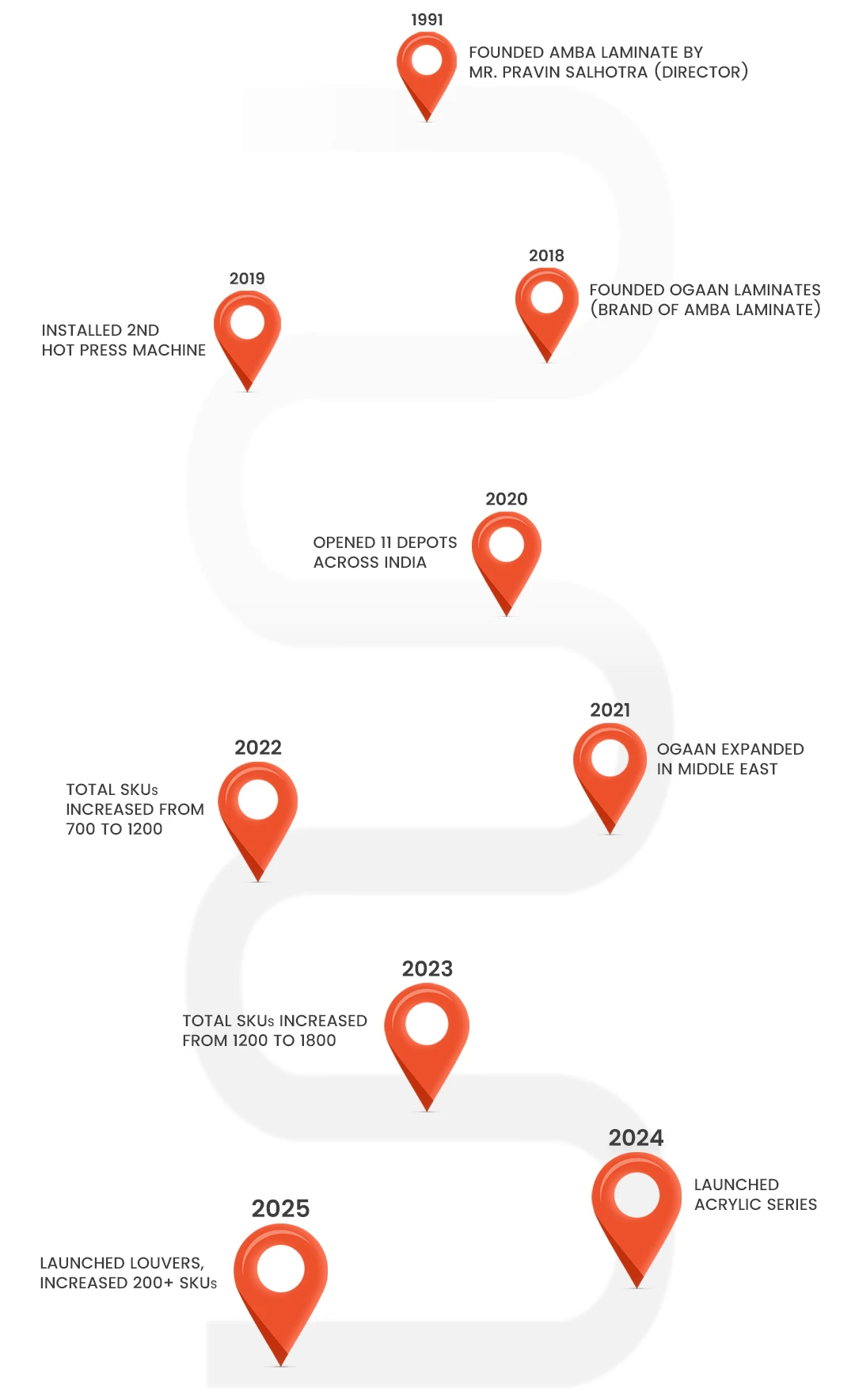 Our legacy began in 1991 with the establishment of Amba Laminates by our visionary Director, Mr. Pravin Salhotra. With over 33 years of experience in the laminate industry and an unwavering commitment to quality and reliability, Amba Laminates earned the enduring trust of architects, dealers, distributors, carpenters, and contractors across India.