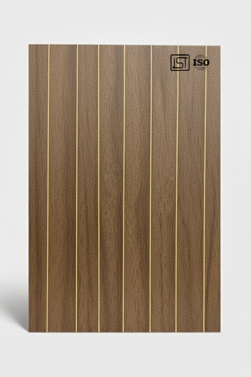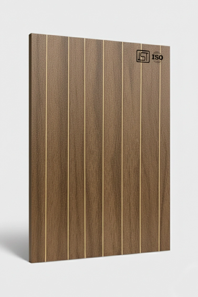 Explore golden linear patterned laminate sheets in a medium walnut brown silky matt finish with natural wooden texture for elegant spaces.