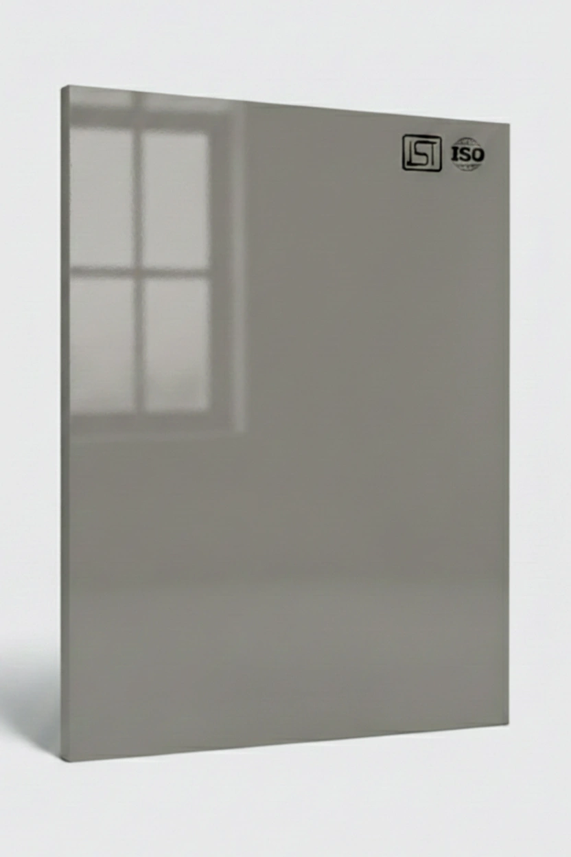 Luxurious grey decorative acrylic laminate featuring smooth solid color texture and a high gloss finish, perfect for modern interiors.