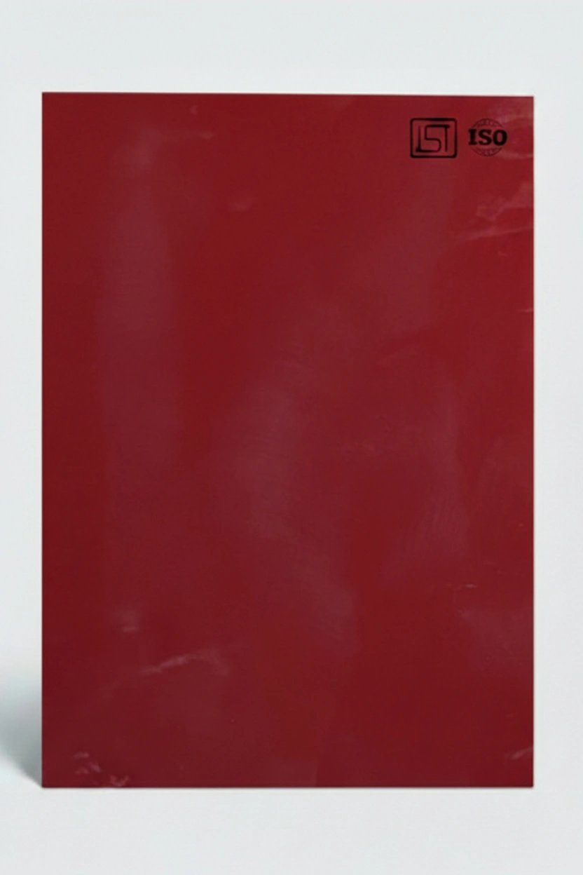 Luxurious ruby maroon decorative acrylic laminate featuring smooth solid color texture and a high gloss finish, perfect for modern interiors.
