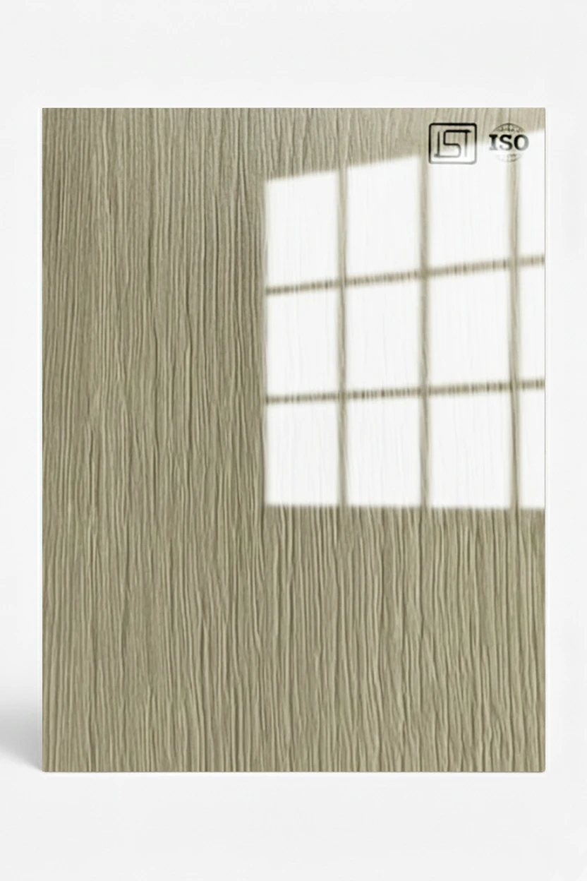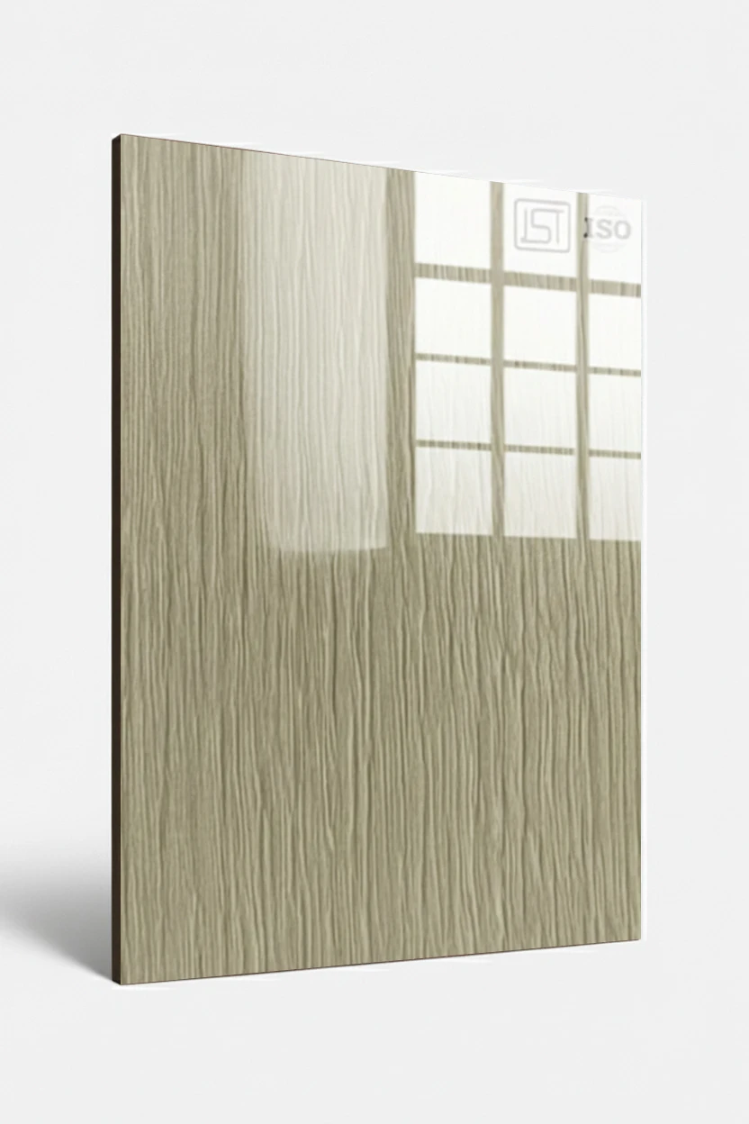 Elegant light ash beige colored decorative laminate featuring fine woodgrain texture in high gloss finish, perfect for modern interiors.