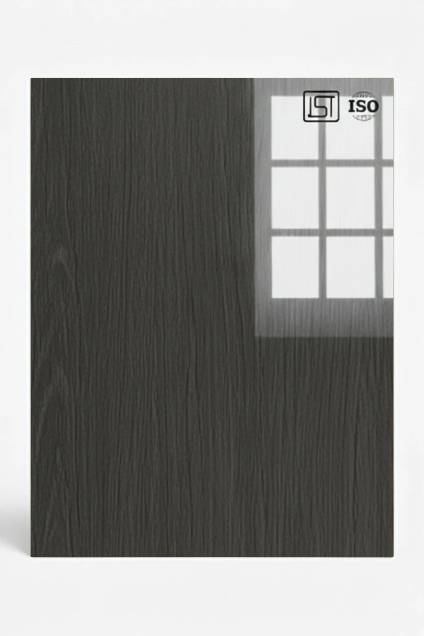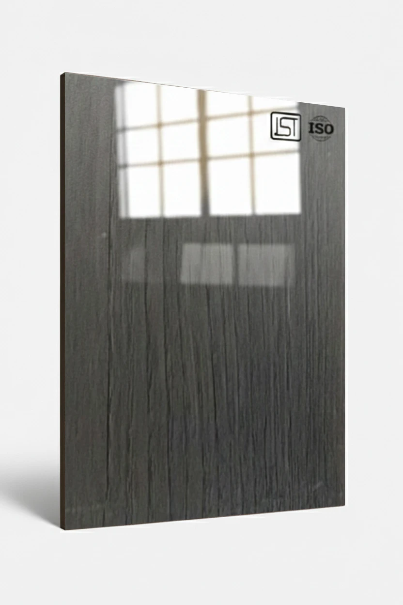 Elegant fossil grey colored decorative laminate featuring fine woodgrain texture in high gloss finish, perfect for modern interiors.