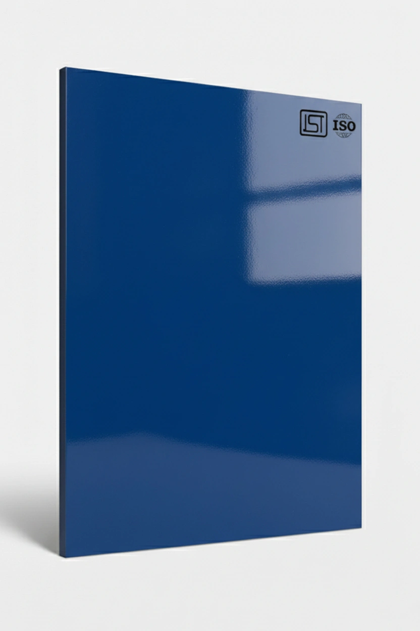 Elegant navy blue, smooth textured decorative laminate with High Gloss finish perfect for modern interiors.