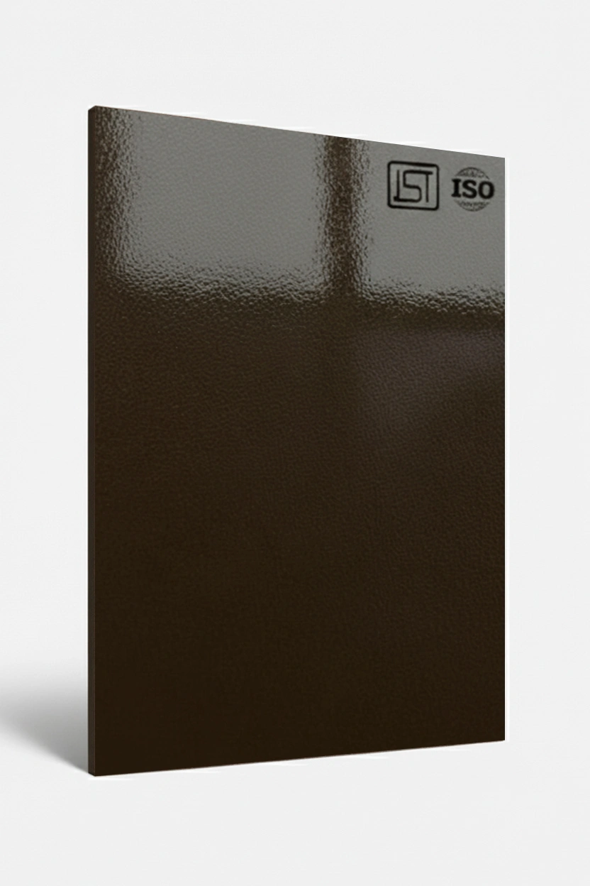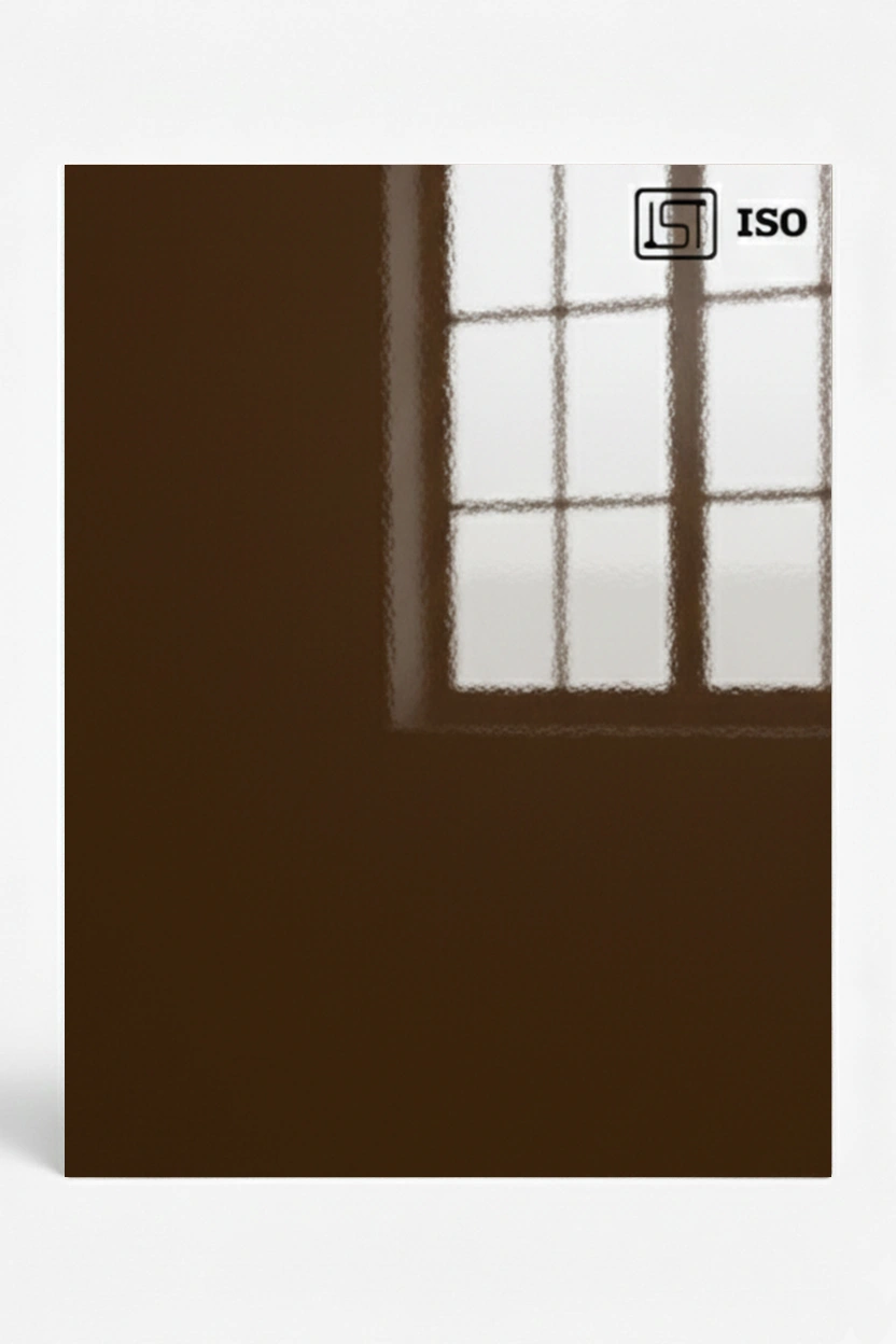 Luxurious dark brown decorative laminate featuring smooth solid color texture and a high gloss finish, perfect for modern interiors.