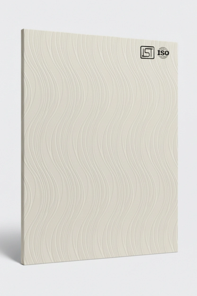 Luxurious pearl white colored decorative laminate with smooth shiny 3D grooves texture and shiny matt finish, perfect for modern interiors.