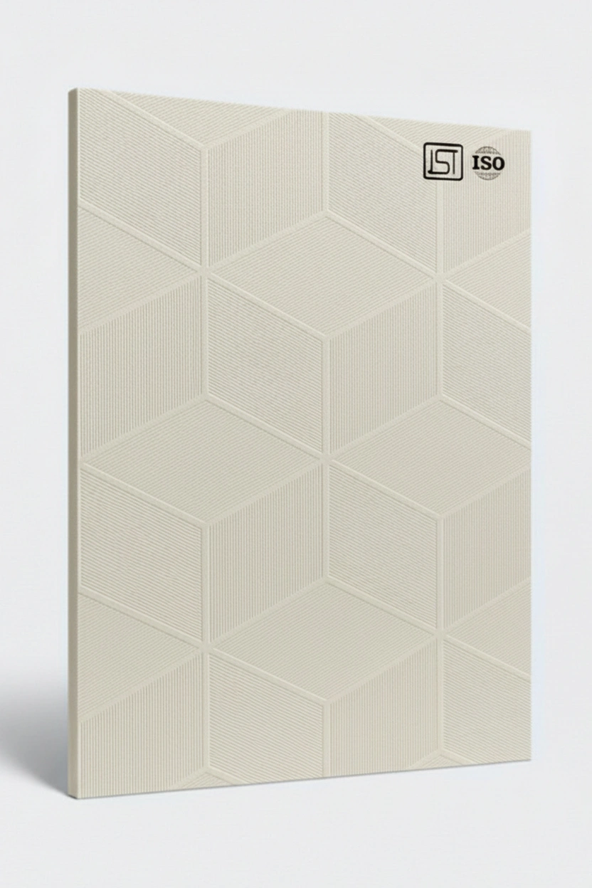 Elegant pearl white colored decorative laminate with smooth shiny 3D grooves texture and shiny matt finish, perfect for luxurious interiors.