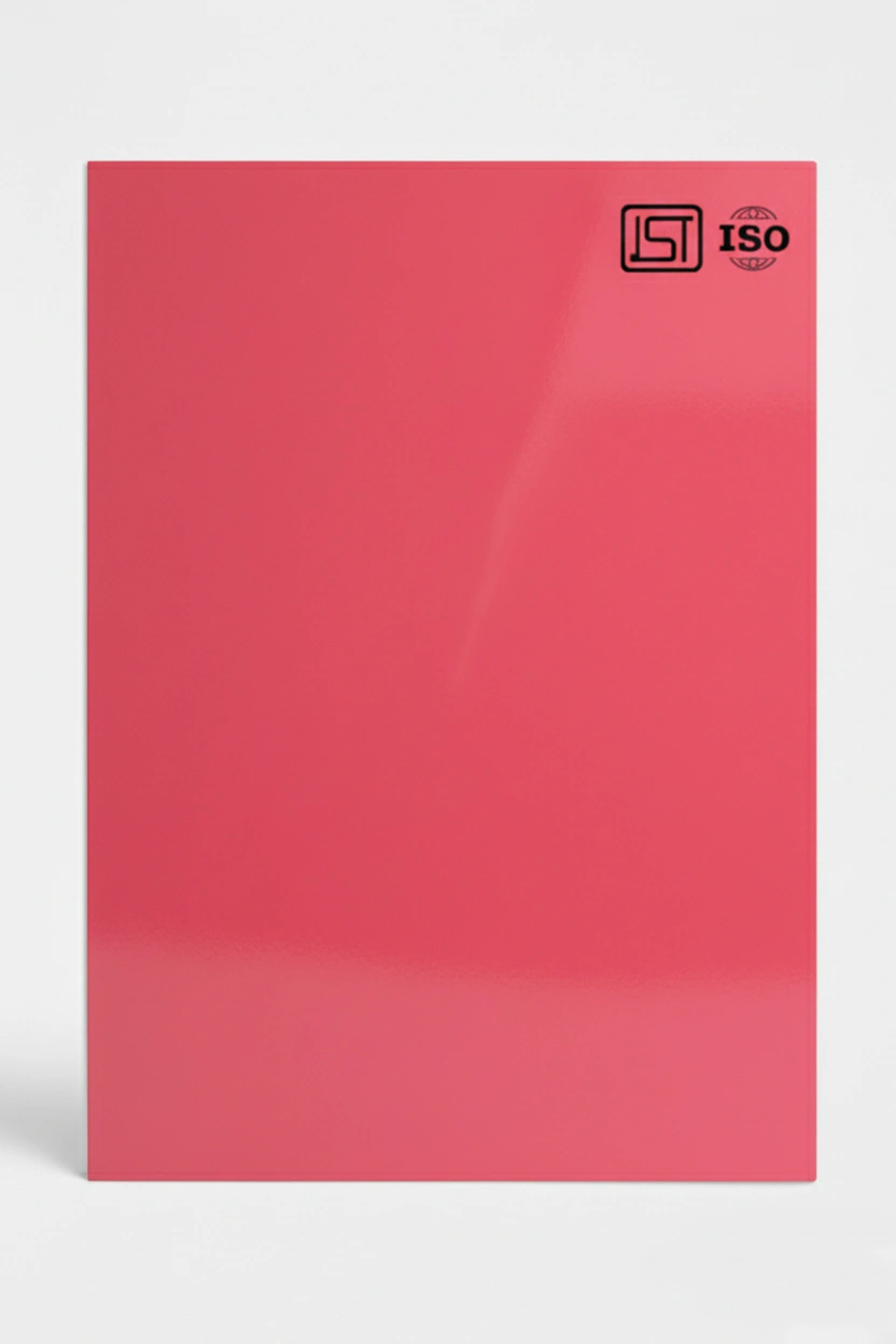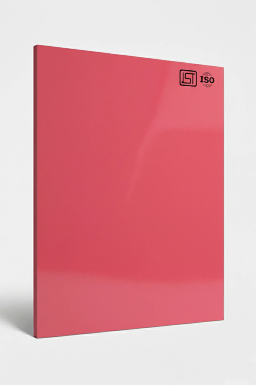 Elegant bright coral pink, smooth textured decorative laminate with High Gloss finish perfect for modern interiors.