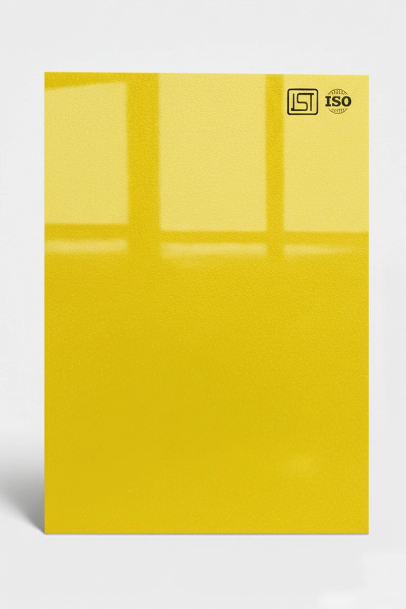 Elegant lemon yellow smooth textured decorative laminate with high gloss finish perfect for modern interiors.