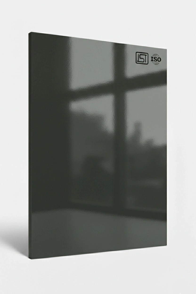 Elegant dark charcoal grey, smooth textured decorative laminate with high gloss finish perfect for modern interiors.