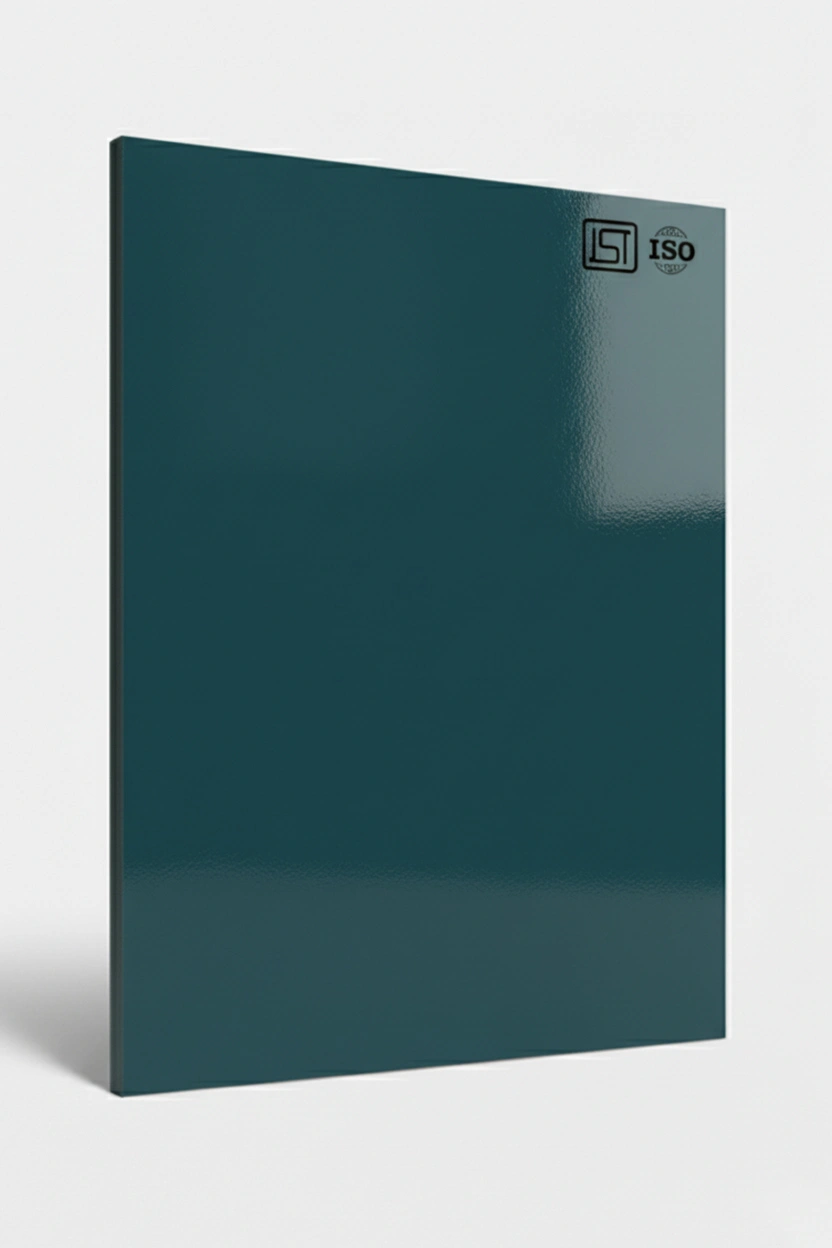 Elegant Dark Teal Blue, smooth textured decorative laminate with High Gloss finish perfect for modern interiors.