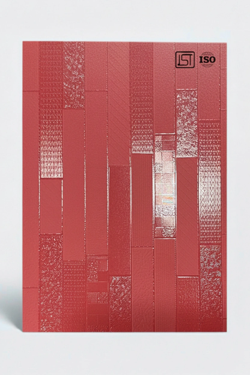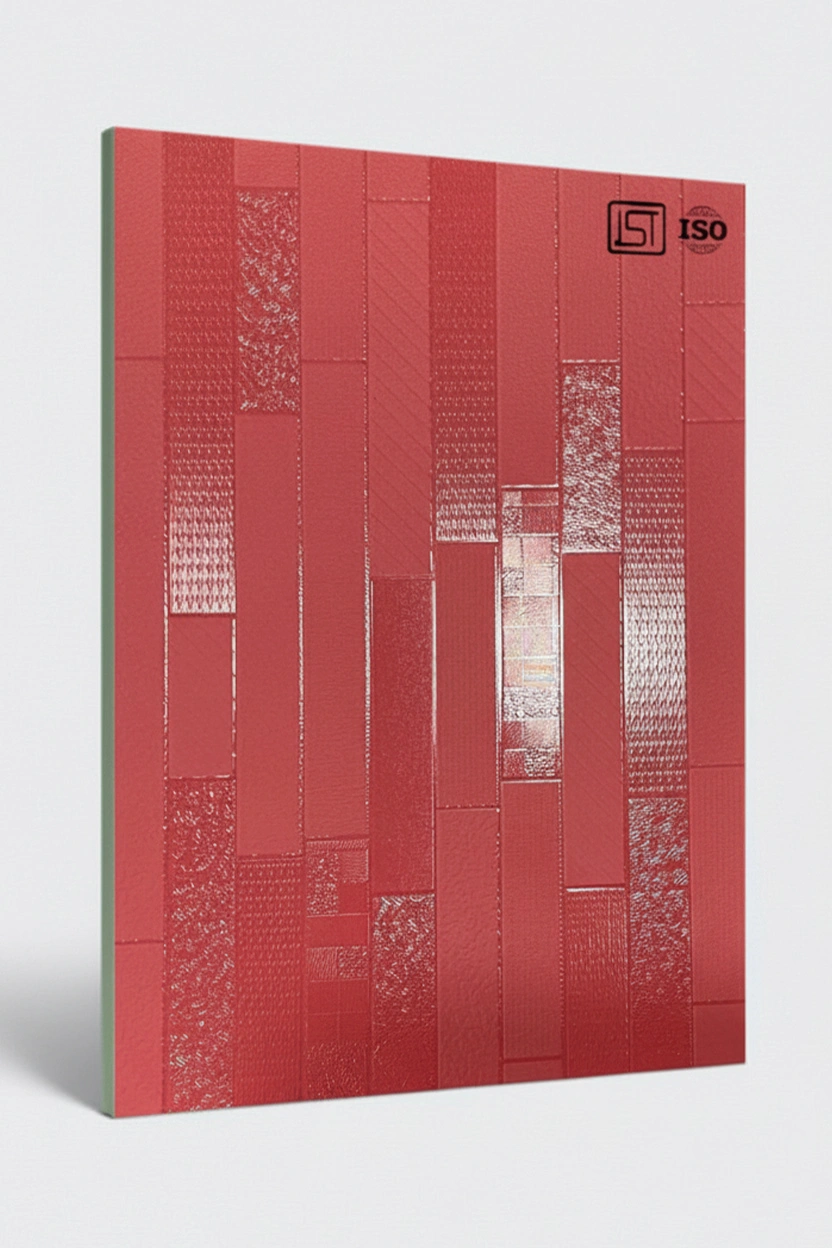 Luxurious fluroscent pink decorative laminate featuring 3D grooves monochromatic plank design texture and a subtle shiny matt finish, perfect for modern interiors.