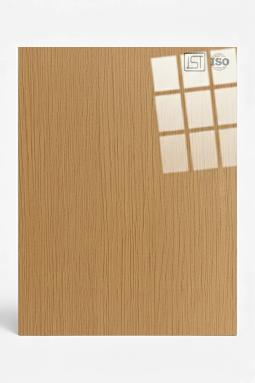 Elegant light oak beige colored decorative laminate featuring subtle woodgrain texture in high gloss finish, perfect for modern interiors.