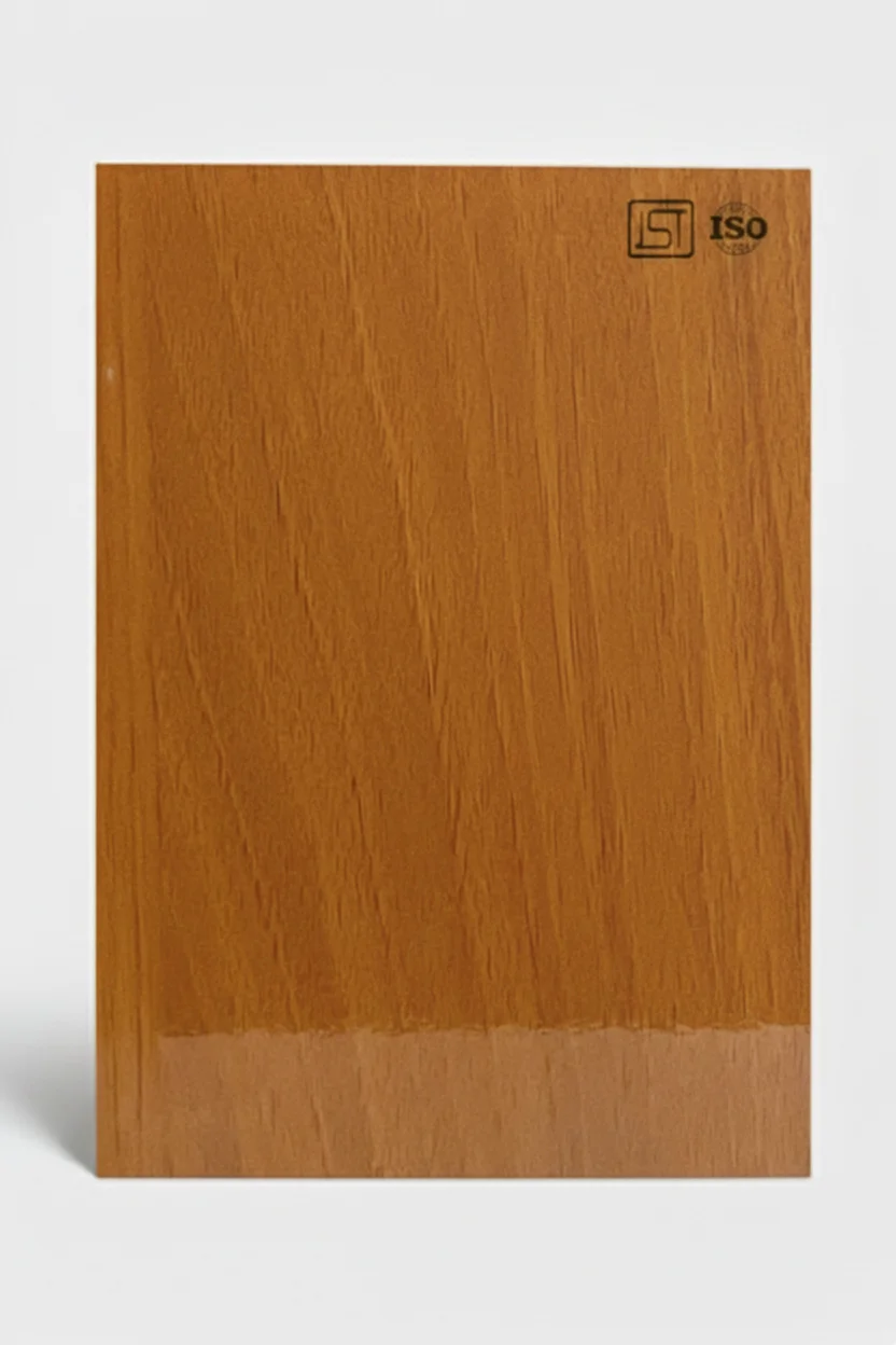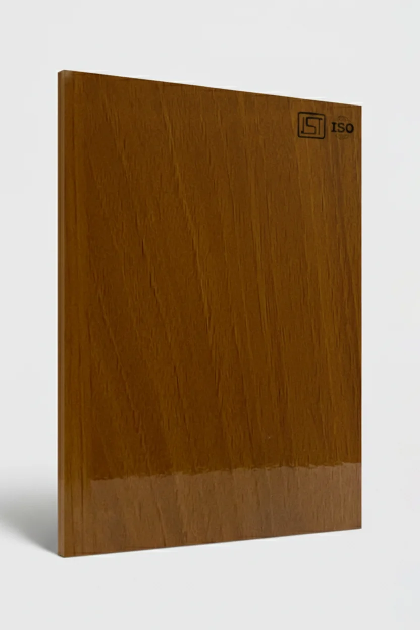 Elegant honey oak colored decorative laminate featuring subtle woodgrain texture in high gloss finish, perfect for modern interiors.