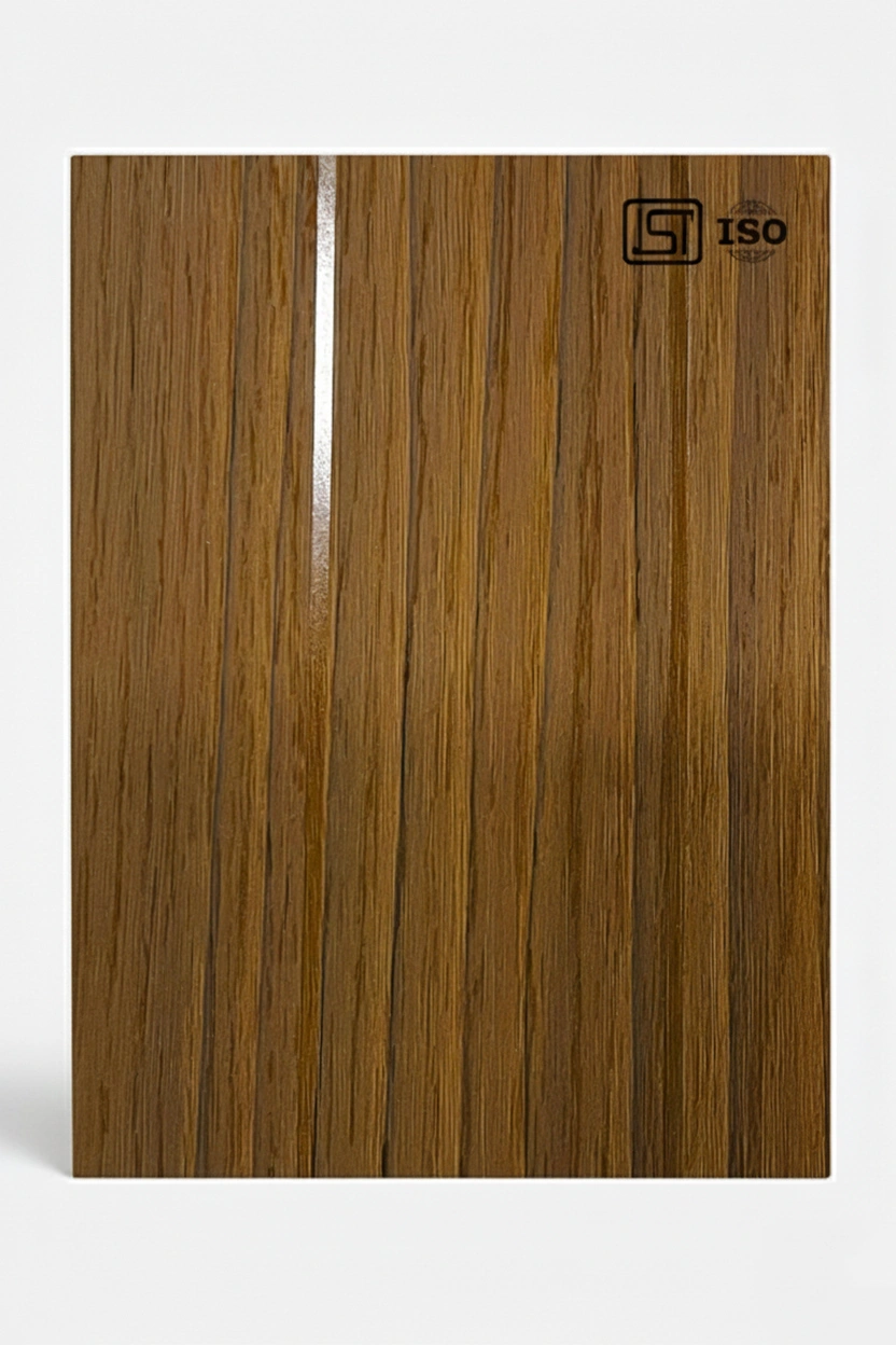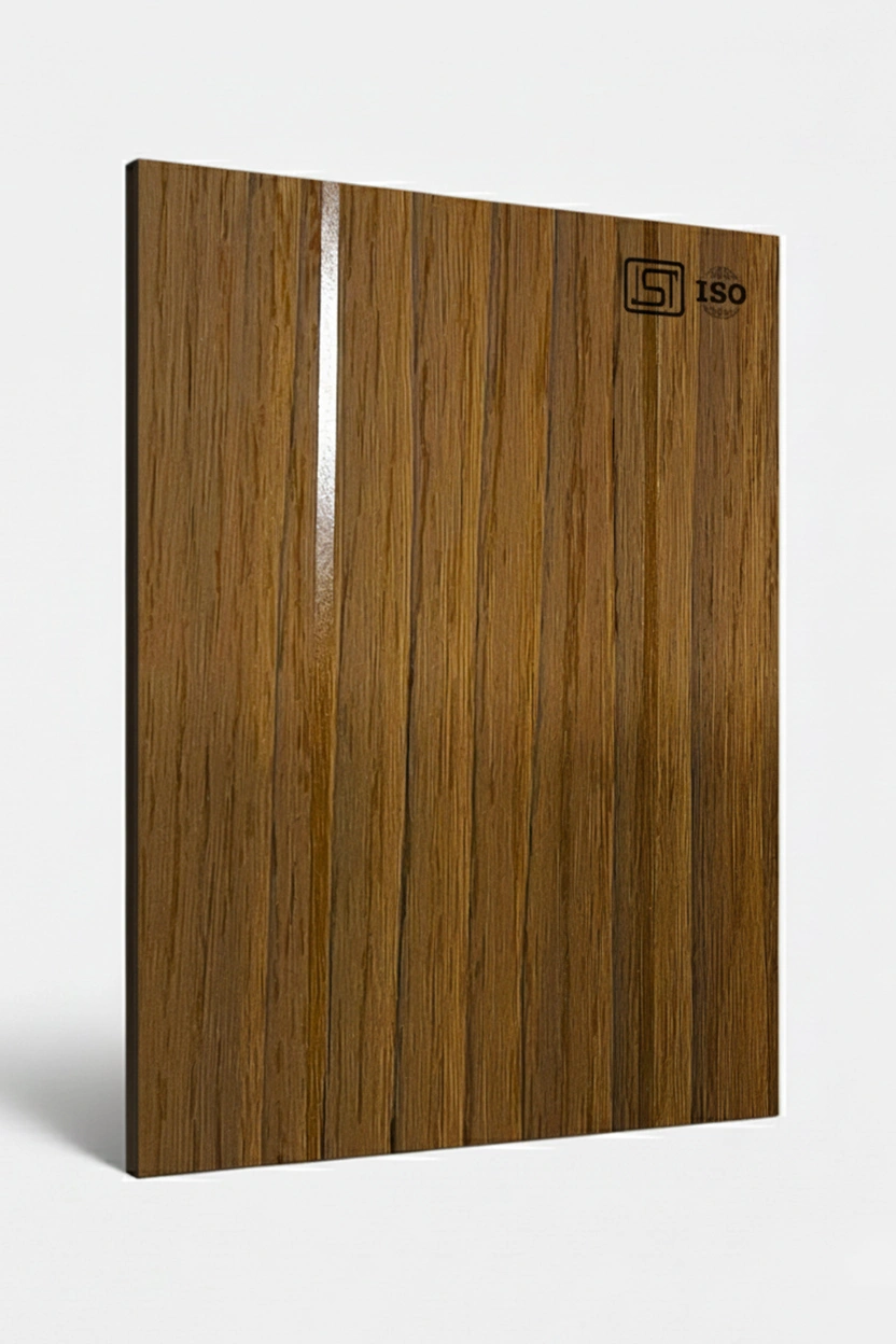 Elegant teak brown colored decorative laminate featuring natural wood texture with woodgrain design in matt and glossy stripe finish, perfect for modern interiors.