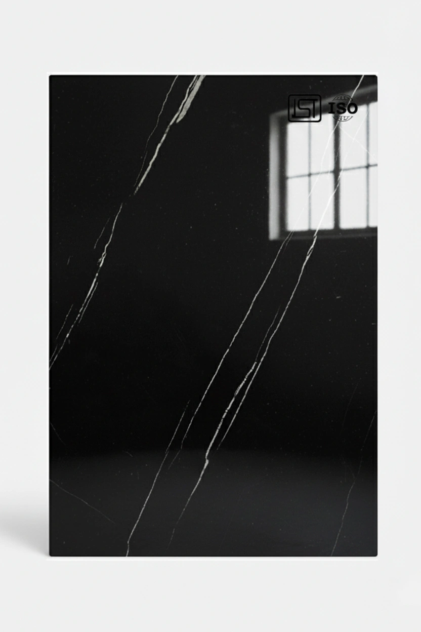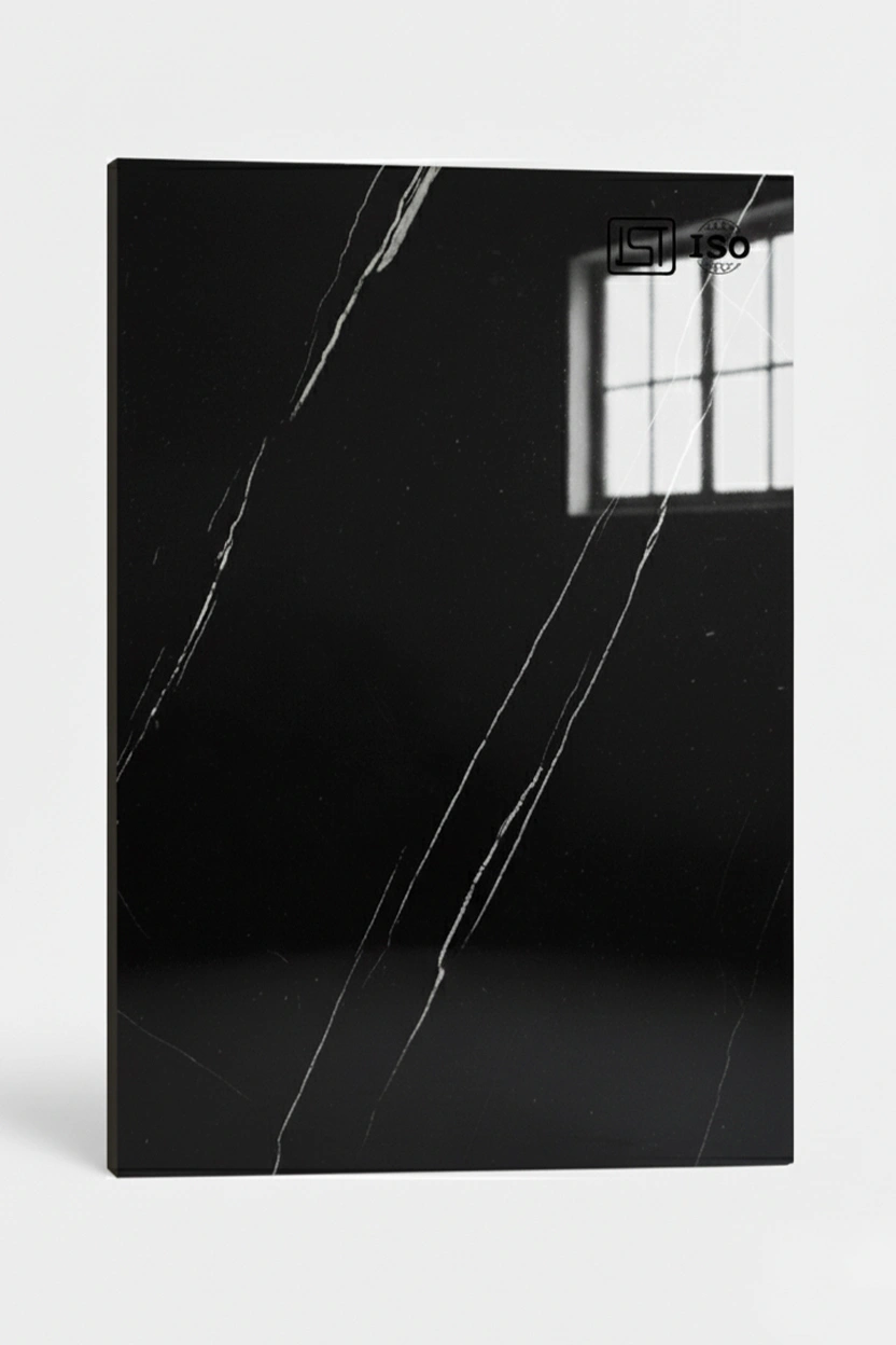 Elevate interiors with jet black colored laminate featuring a smooth marble texture in a high gloss finish, perfect for modern interiors.