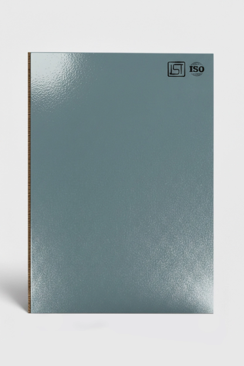 Elegant dusty teal colored decorative laminate in a high-gloss finish, perfect for modern interiors.