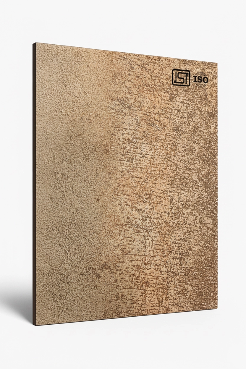 Elegant sand beige colored decorative laminate feauring rust texture in matt finish, perfect for modern interiors.