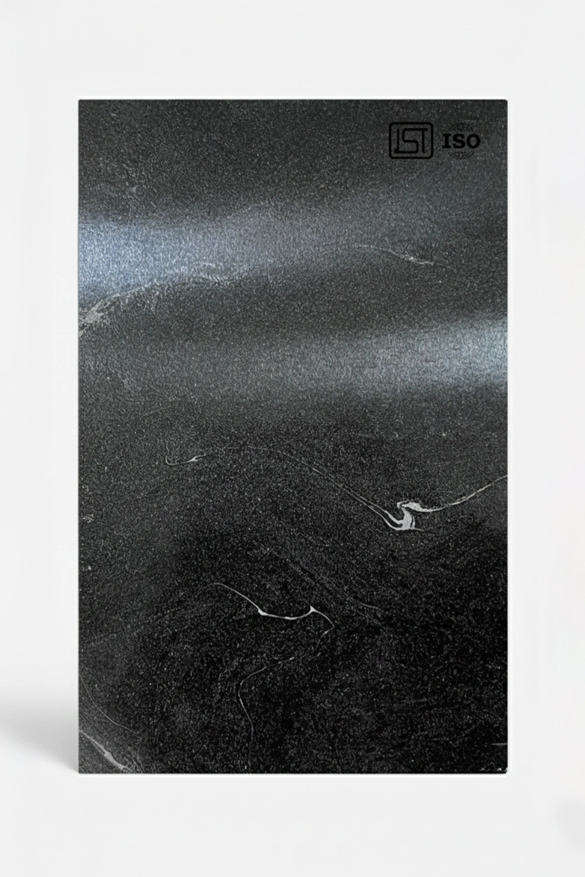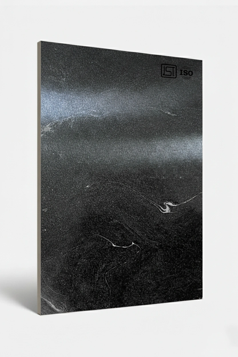 Enhance interiors with charcoal black decorative laminate featuring a marble texture, elegant white veining, and a glossy finish perfect for luxurious interiors.