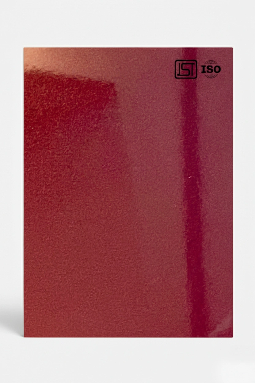 Elegant Maroon colored laminate with metallic shimmer texture and high gloss finish perfect for modern interiors.