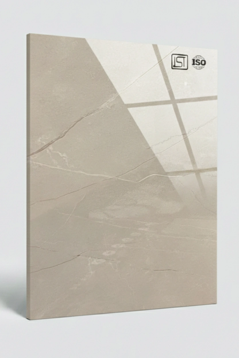Luxurious light grey decorative acrylic laminate featuring smooth marble texture and a high gloss finish, perfect for modern interiors.