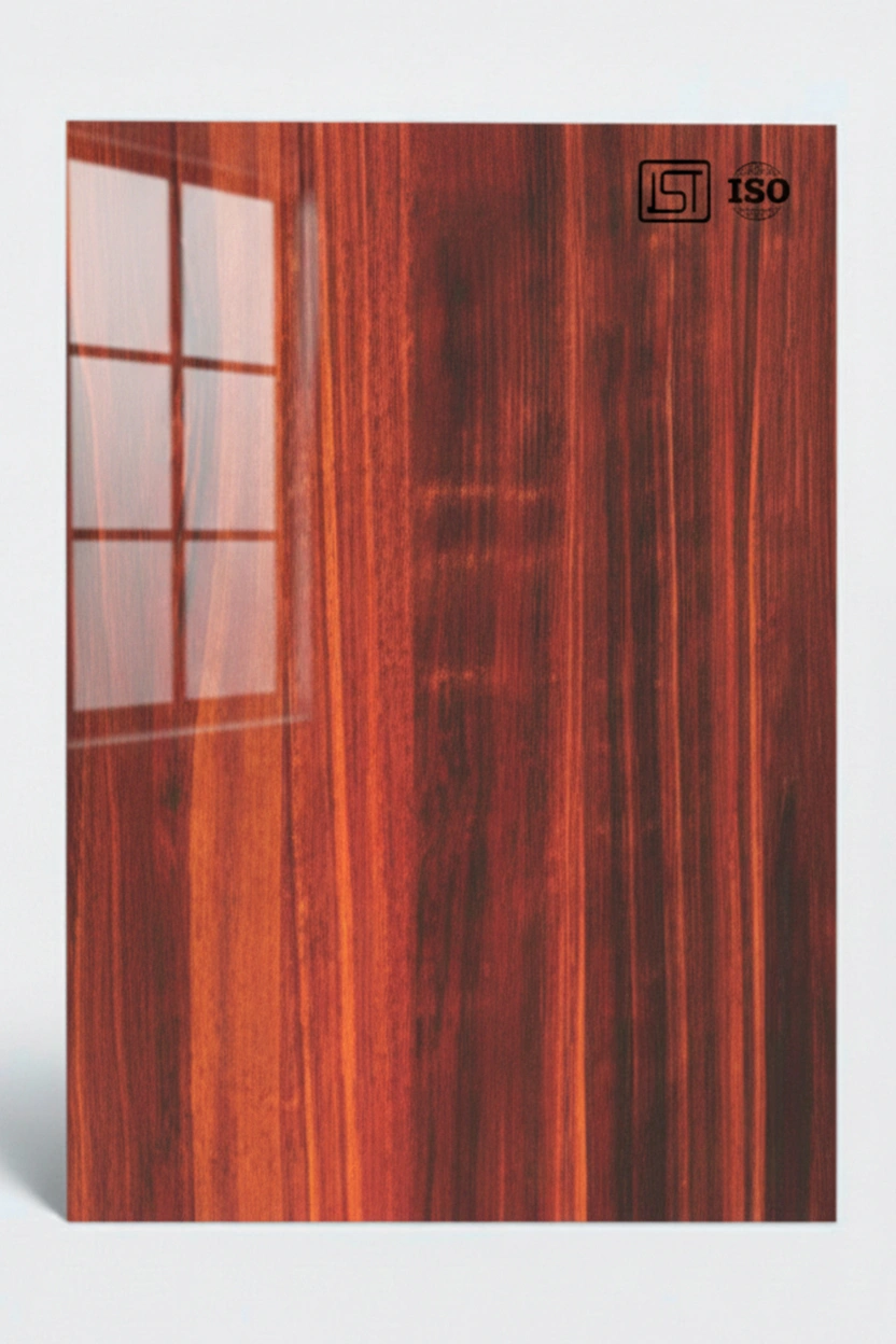 Luxurious reddish walnut decorative acrylic laminate featuring smooth natural wooden texture and a high gloss finish, perfect for modern interiors.
