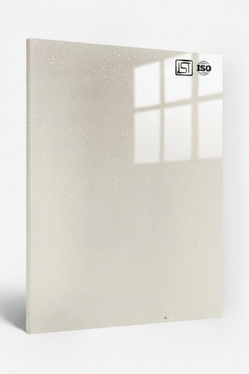Luxurious off-white decorative acrylic laminate featuring smooth, sparkly metallic texture and a high gloss finish, perfect for modern interiors.