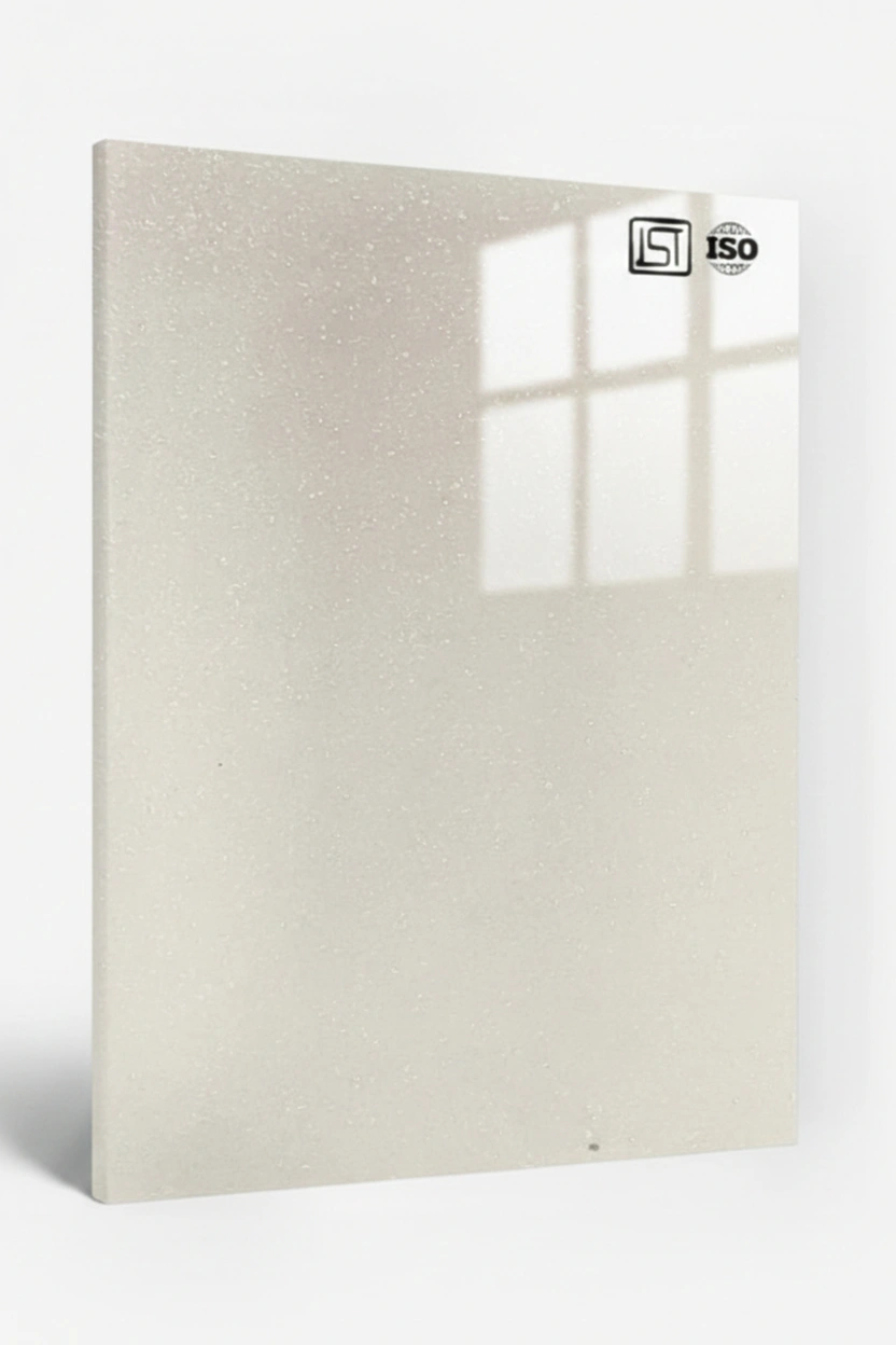 Luxurious off-white decorative acrylic laminate featuring smooth sparkle texture and a high gloss finish, perfect for modern interiors.