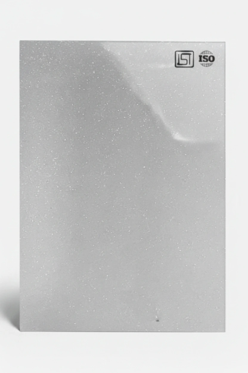Luxurious light silver decorative acrylic laminate featuring smooth sparkle texture and a high gloss finish, perfect for modern interiors.