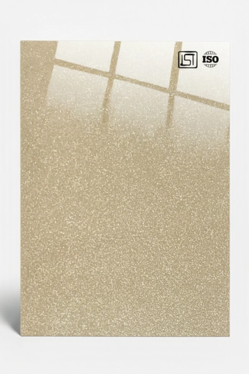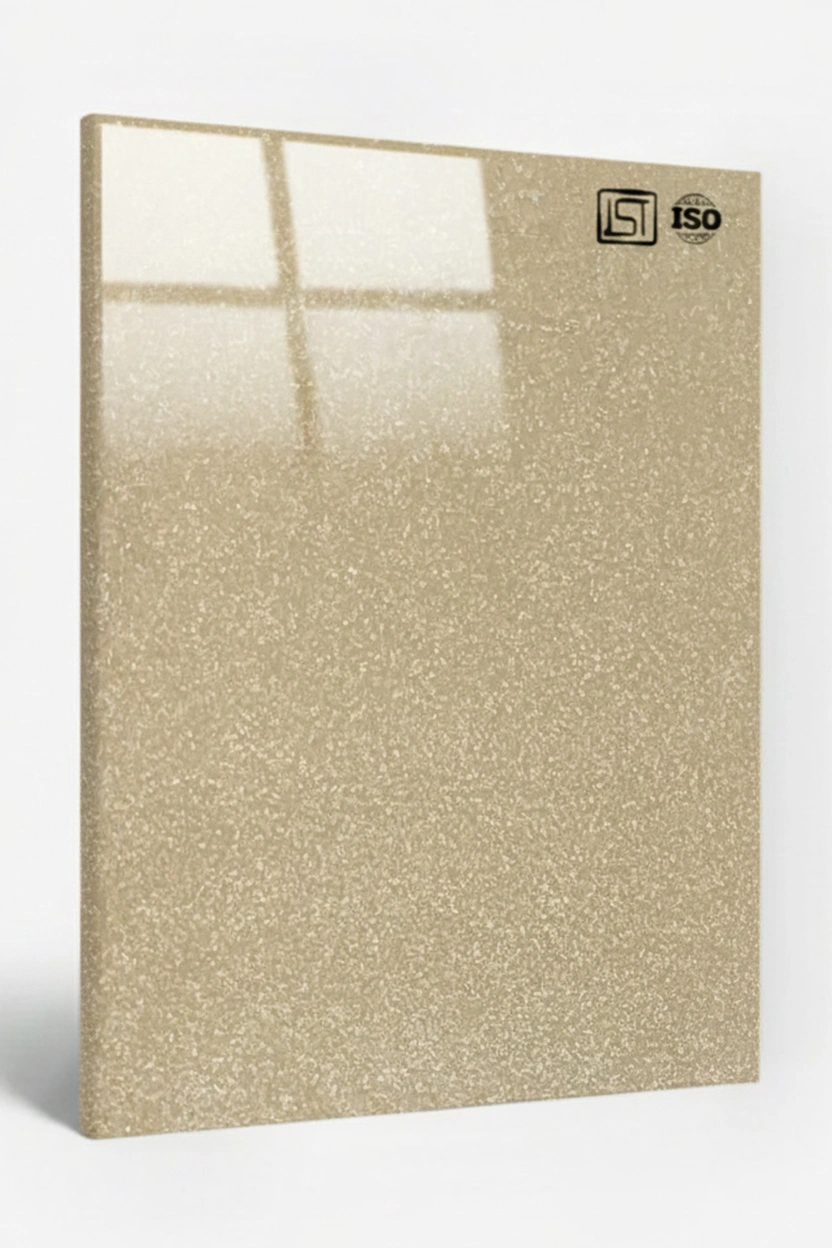 Luxurious light copper gold decorative acrylic laminate featuring smooth sparkle texture and a high gloss finish, perfect for modern interiors.