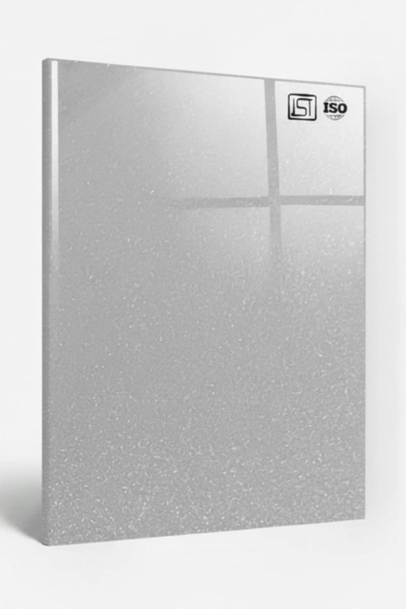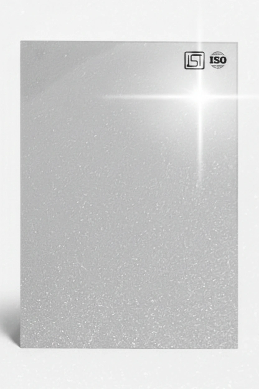 Luxurious silver decorative acrylic laminate featuring smooth sparkle texture and a high gloss finish, perfect for modern interiors.