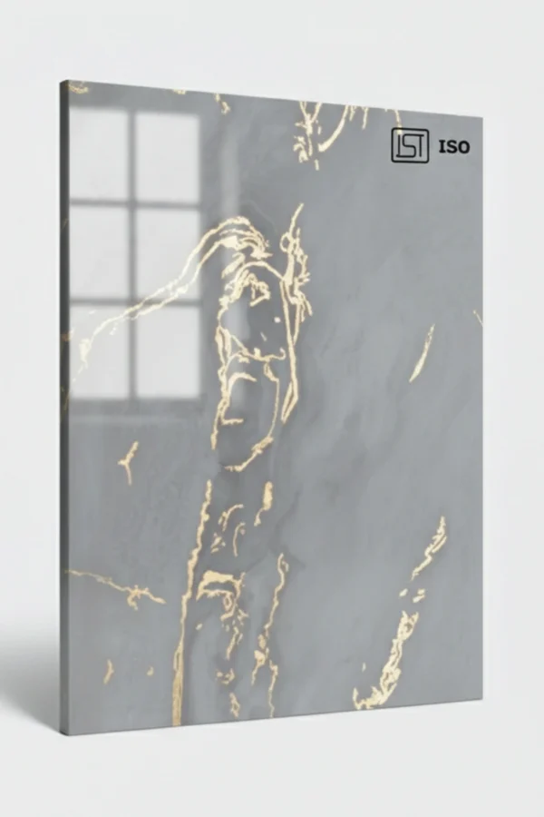 Luxurious concrete grey decorative acrylic laminate featuring marble texture and a high gloss finish, perfect for modern interiors.