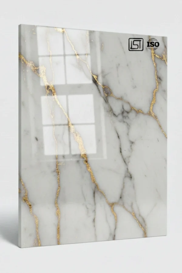 Luxurious off-white decorative acrylic laminate featuring marble texture and a high gloss finish, perfect for modern interiors.
