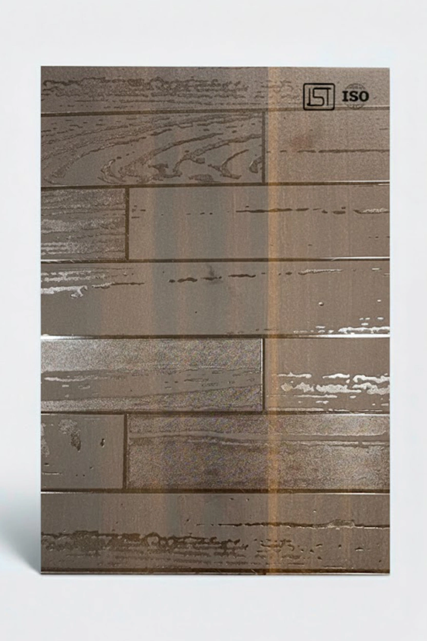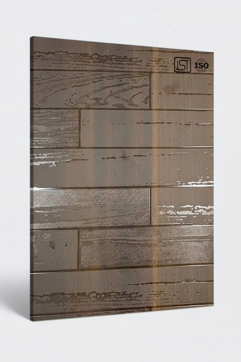 Luxurious natural dark teak colored decorative laminate with smooth shiny 3D wooden wall grooves texture and shiny matt finish, perfect for modern interiors.