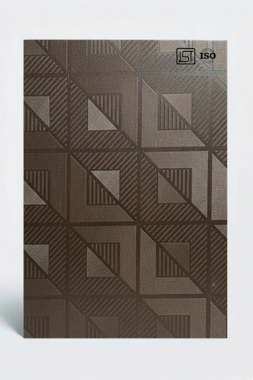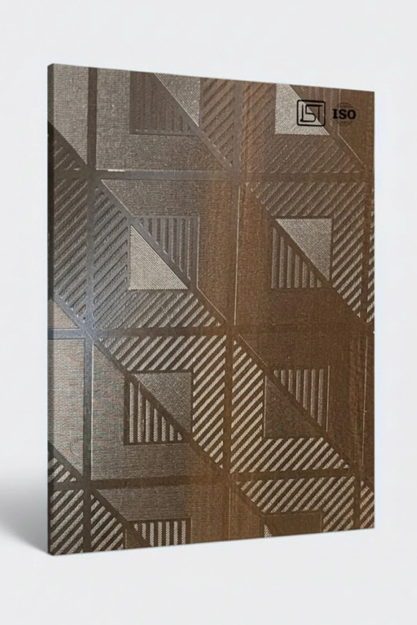 Luxurious natural dark teak colored decorative laminate with smooth shiny 3D vertical grooves texture and shiny matt finish, perfect for modern interiors.