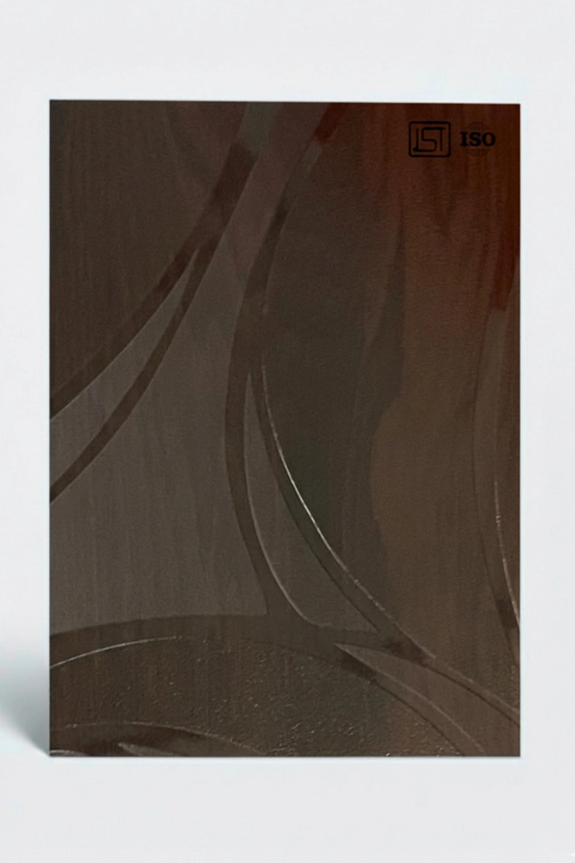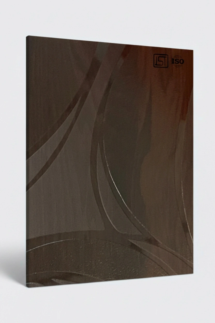 Luxurious dark brown colored decorative laminate with smooth shiny 3D grooves texture and shiny matt finish, perfect for modern interiors.