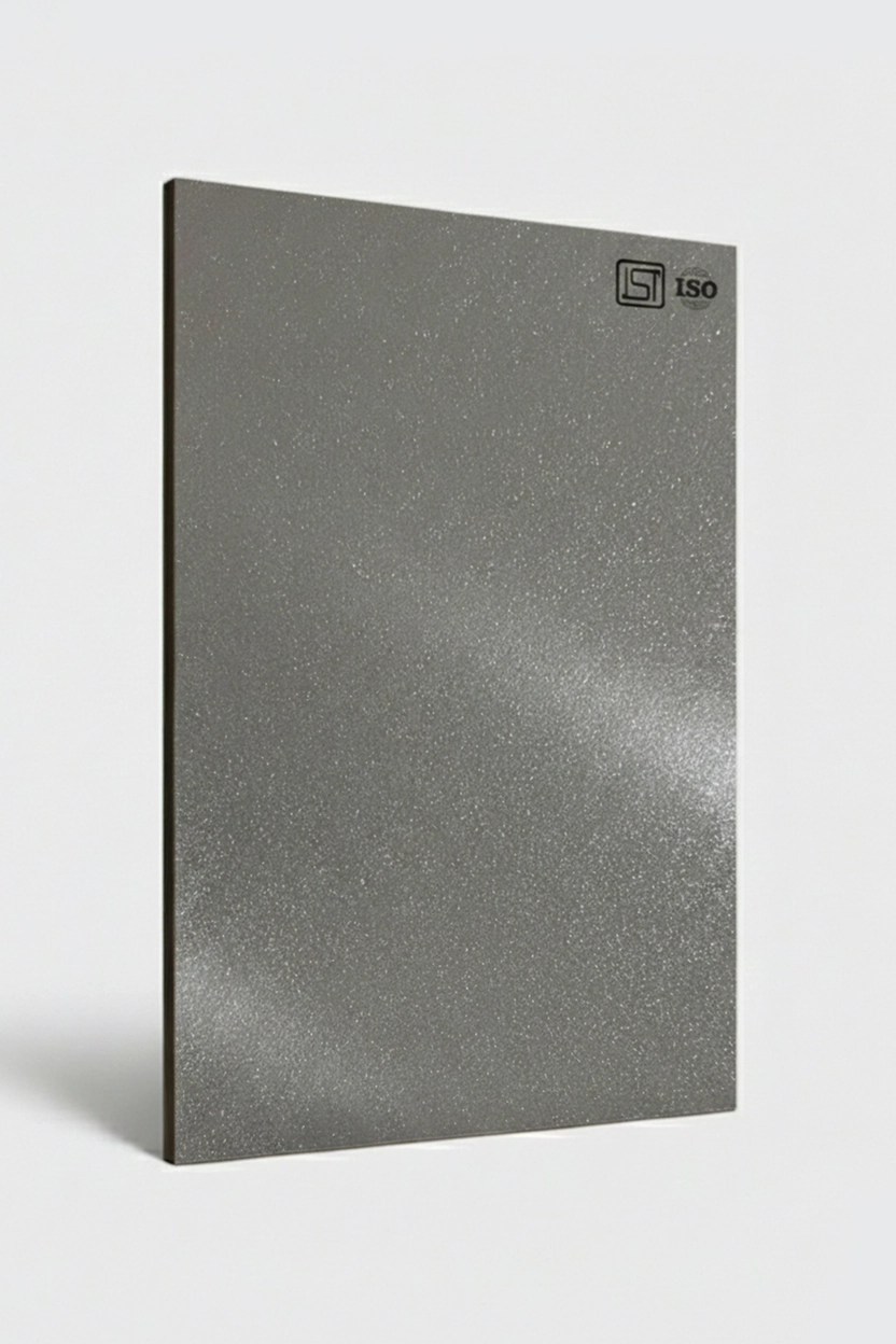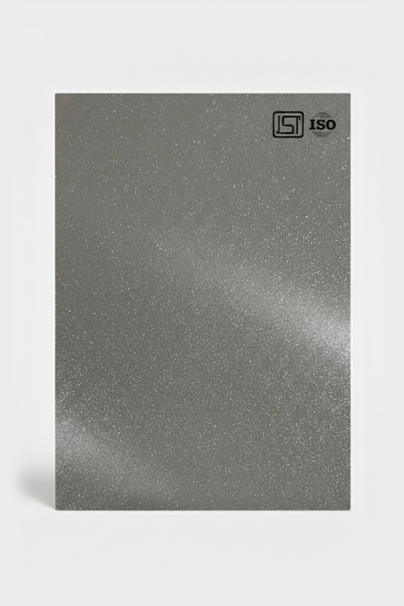 Elegant grey colored decorative laminate featuring shimmer texture in a high-gloss finish, perfect for modern interiors.