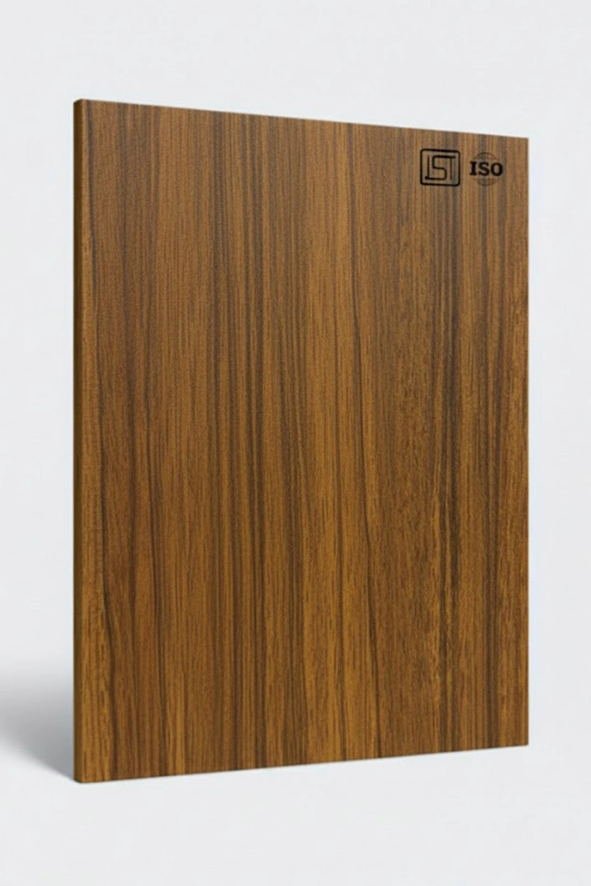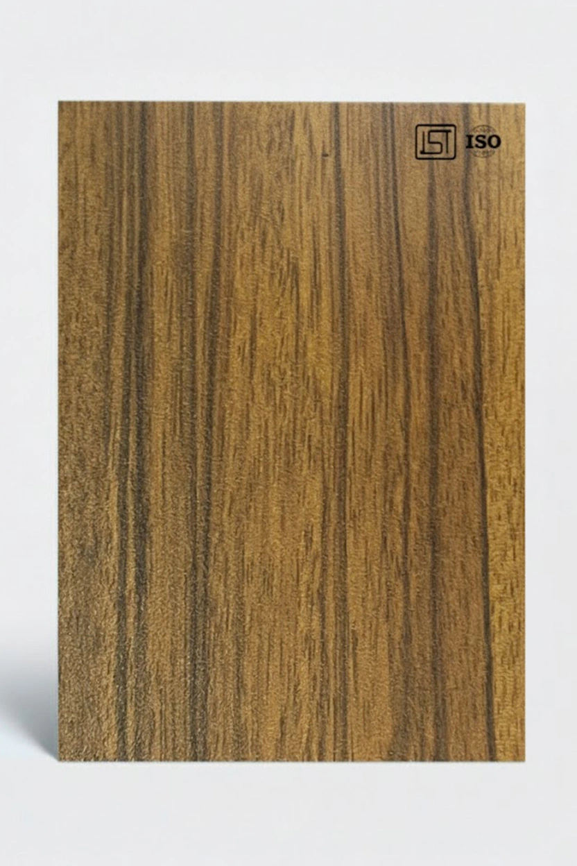Luxurious natural teak decorative laminate featuring woodgrain texture and a suede finish, perfect for modern interiors.
