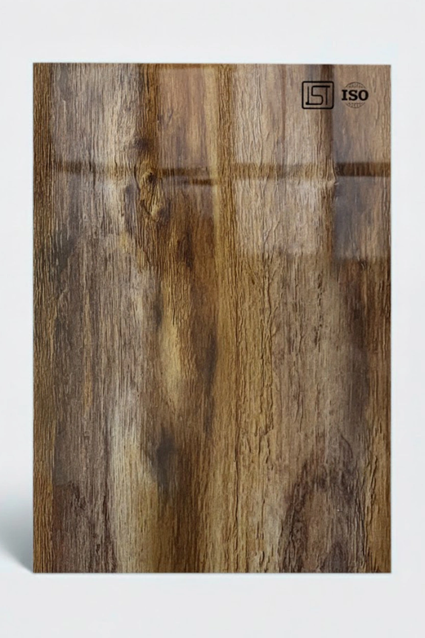 Luxurious naural teak decorative laminate featuring natural looking woodgrain texture and a high gloss finish, perfect for modern interiors.