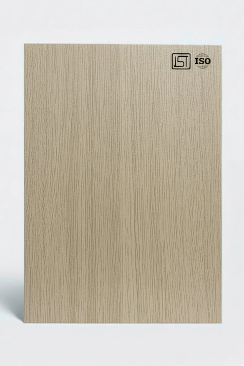 Luxurious light aish beige decorative laminate featuring woodgrain texture and a suede finish, perfect for modern interiors.