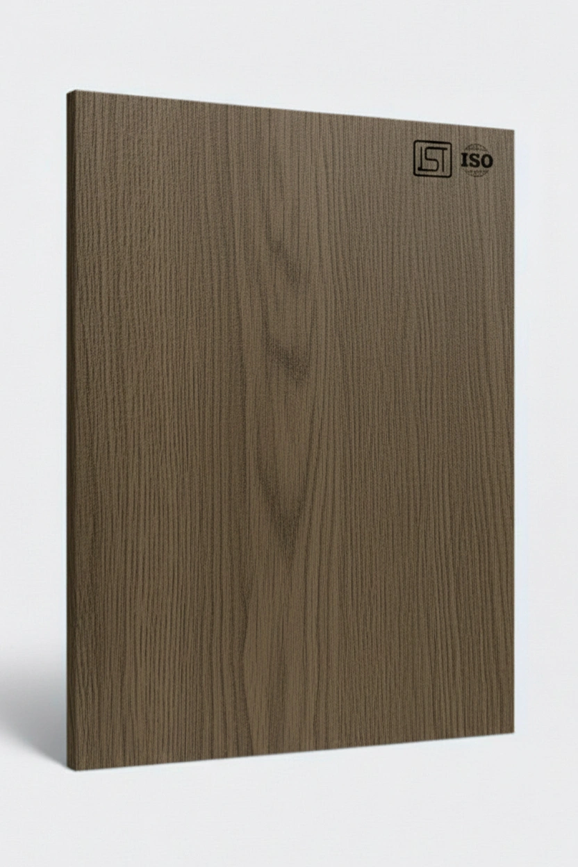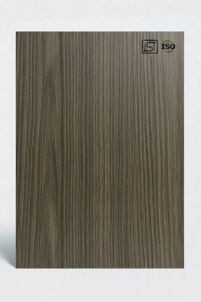 Luxurious albit oak grey decorative laminate featuring wooden texture and a suede finish, perfect for modern interiors.