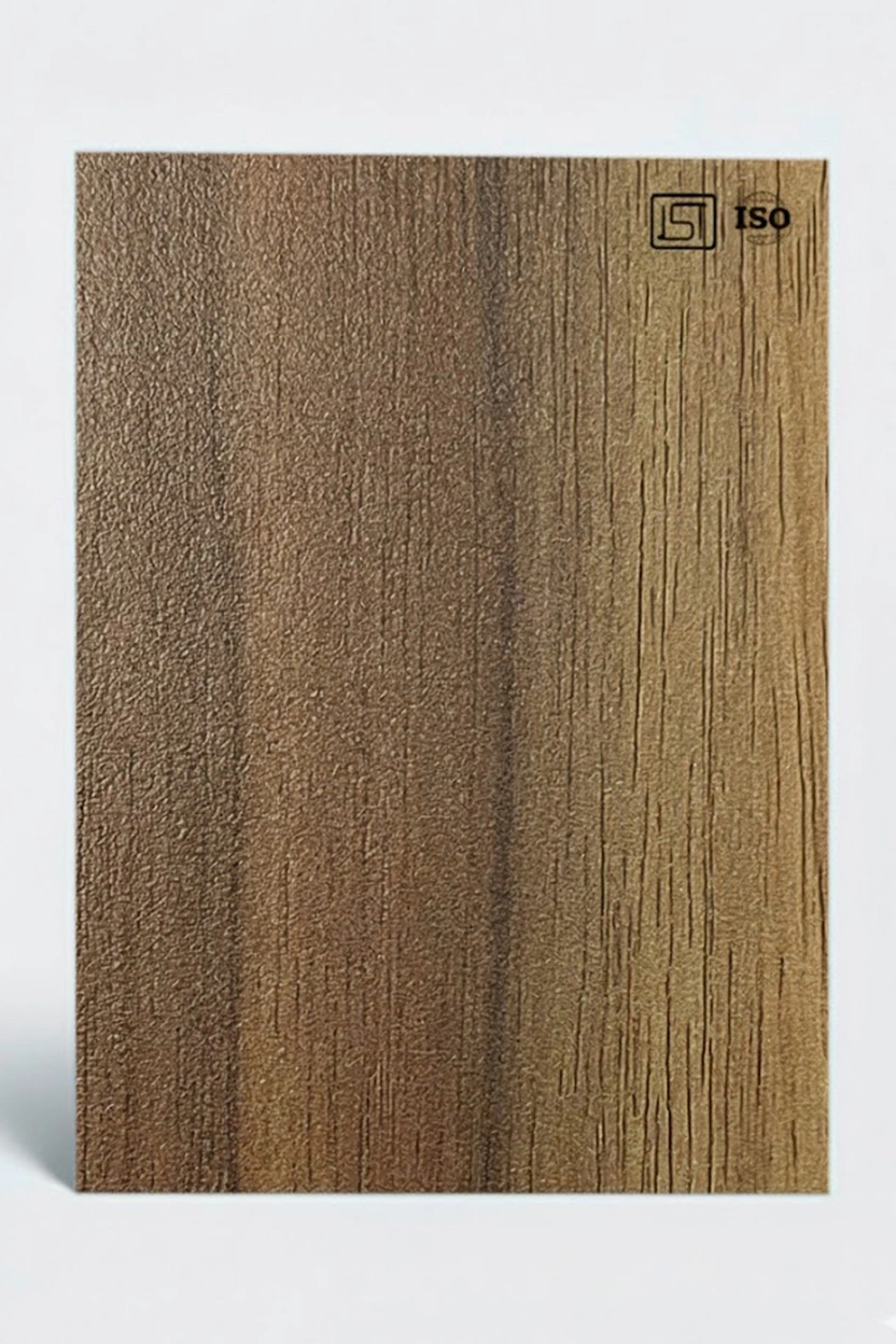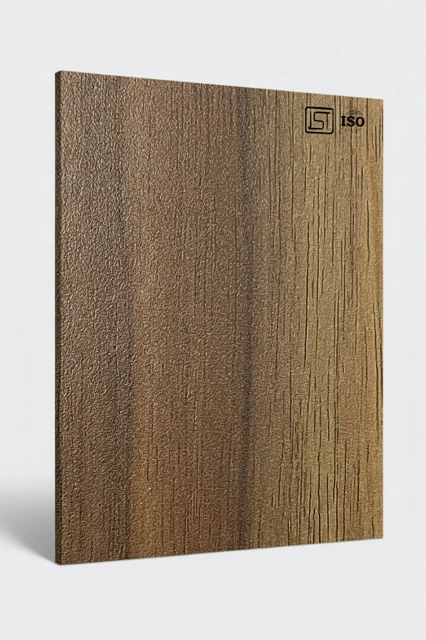 Luxurious golden teak decorative laminate featuring wooden texture and a suede finish, perfect for modern interiors.