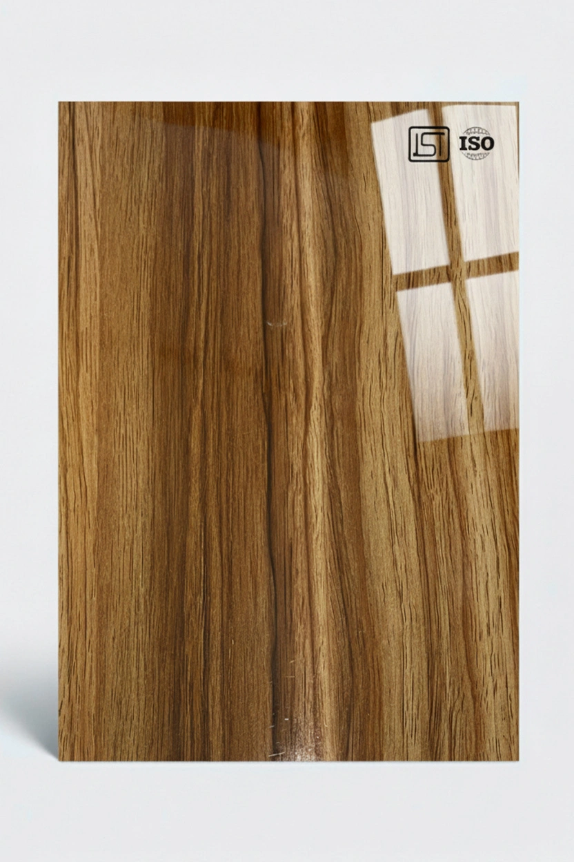 Luxurious golden teak decorative laminate featuring natural looking wooden texture and a high gloss finish, perfect for modern interiors.