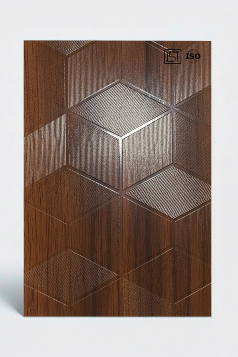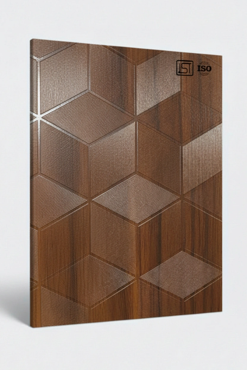 Luxurious natural teak colored decorative laminate with smooth shiny 3D grooves texture and shiny matt finish, perfect for modern interiors.