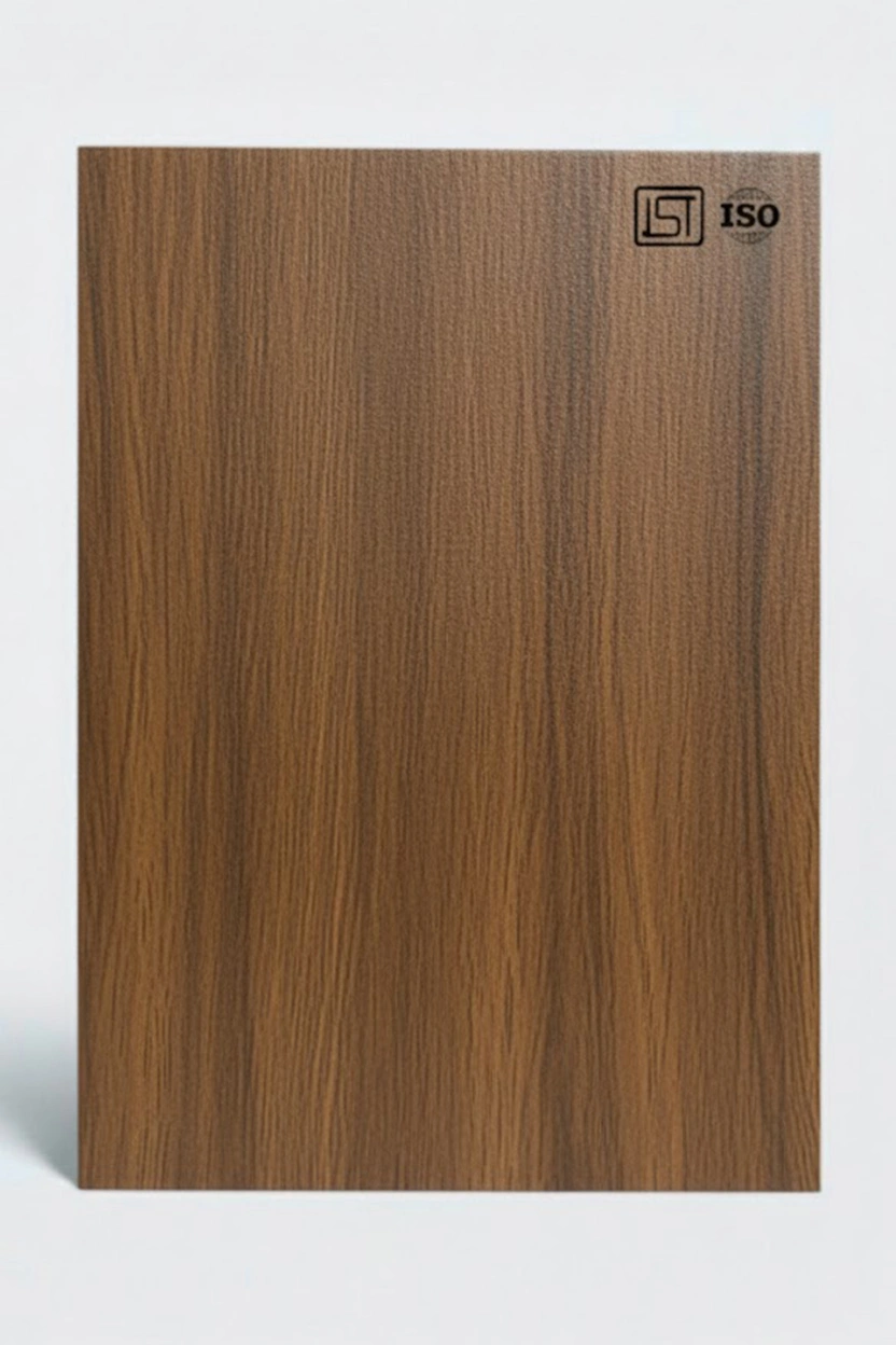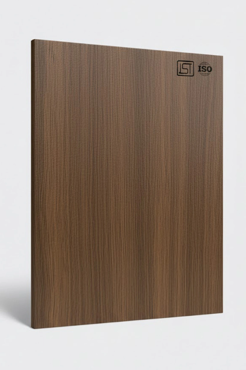 Luxurious dark walnut brown decorative laminate featuring wooden texture and a suede finish, perfect for modern interiors.