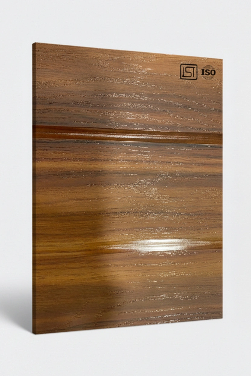 Luxurious natural teak colored woodgrain textured laminate with single shiny stripes in matt finish, perfect for modern interiors.