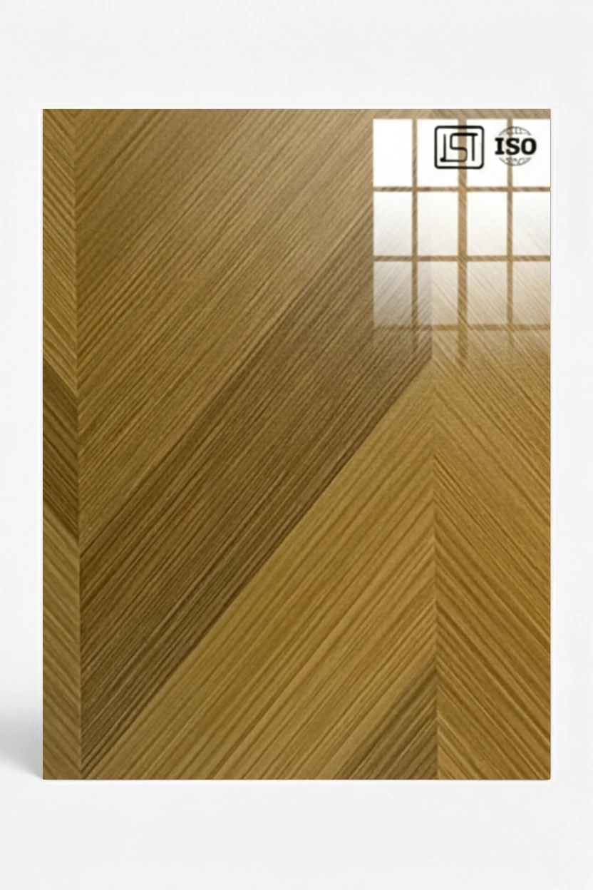 Luxurious light golden teak decorative laminate featuring abstract wooden texture and a high gloss finish, perfect for modern interiors.