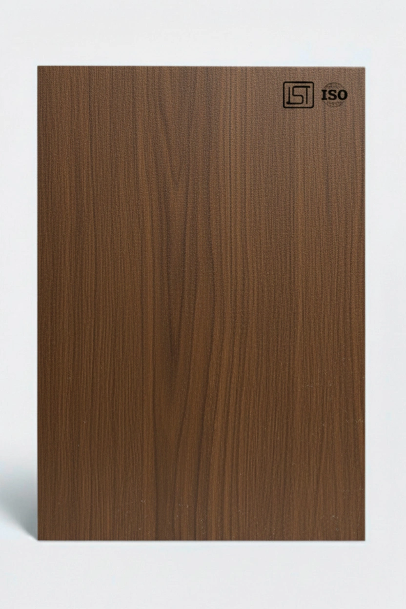 Elegant dark walnut brown colored decorative laminate with smooth wooden texture and shiny matt finish, perfect for luxurious interiors.