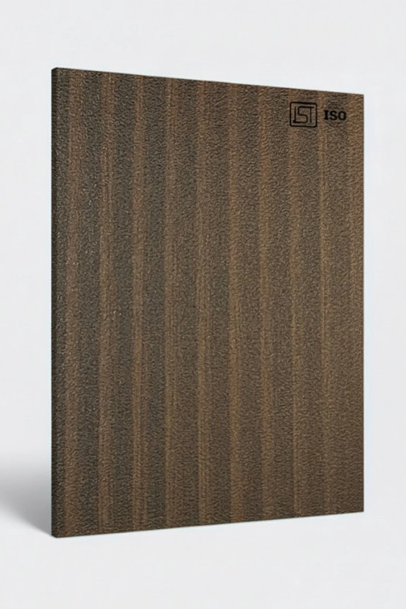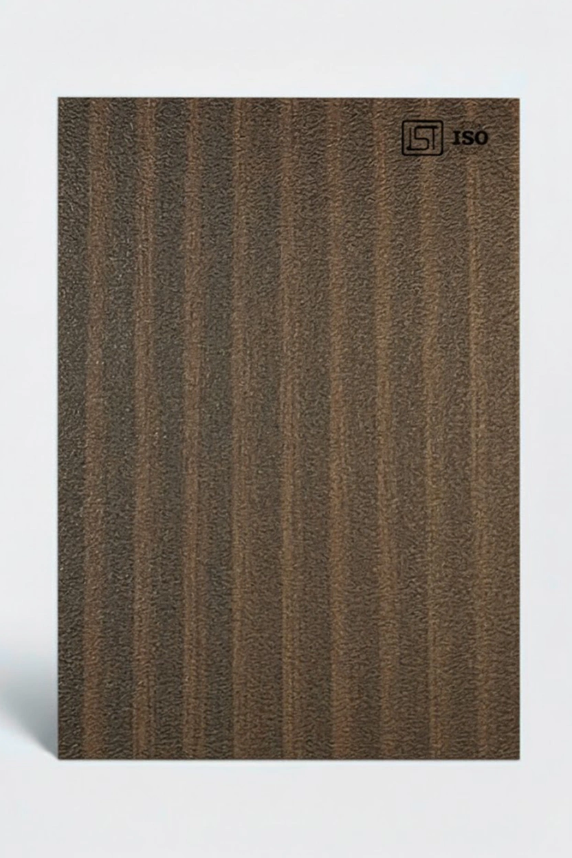 Luxurious espresso brown decorative laminate featuring wooden texture and a suede finish, perfect for modern interiors.