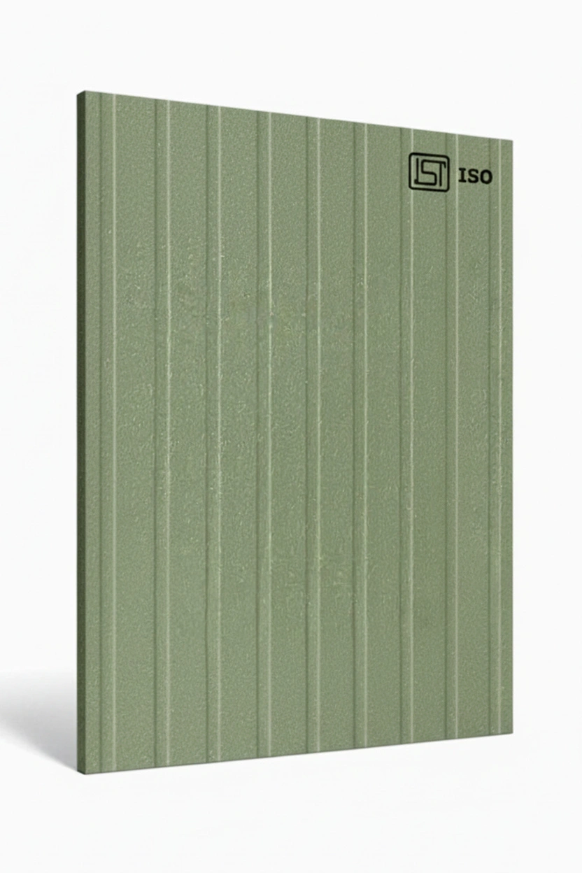 Soothing pastel sage laminate featuring fluted texture in metallic high gloss finish, ideal for modern and elegant interior spaces.